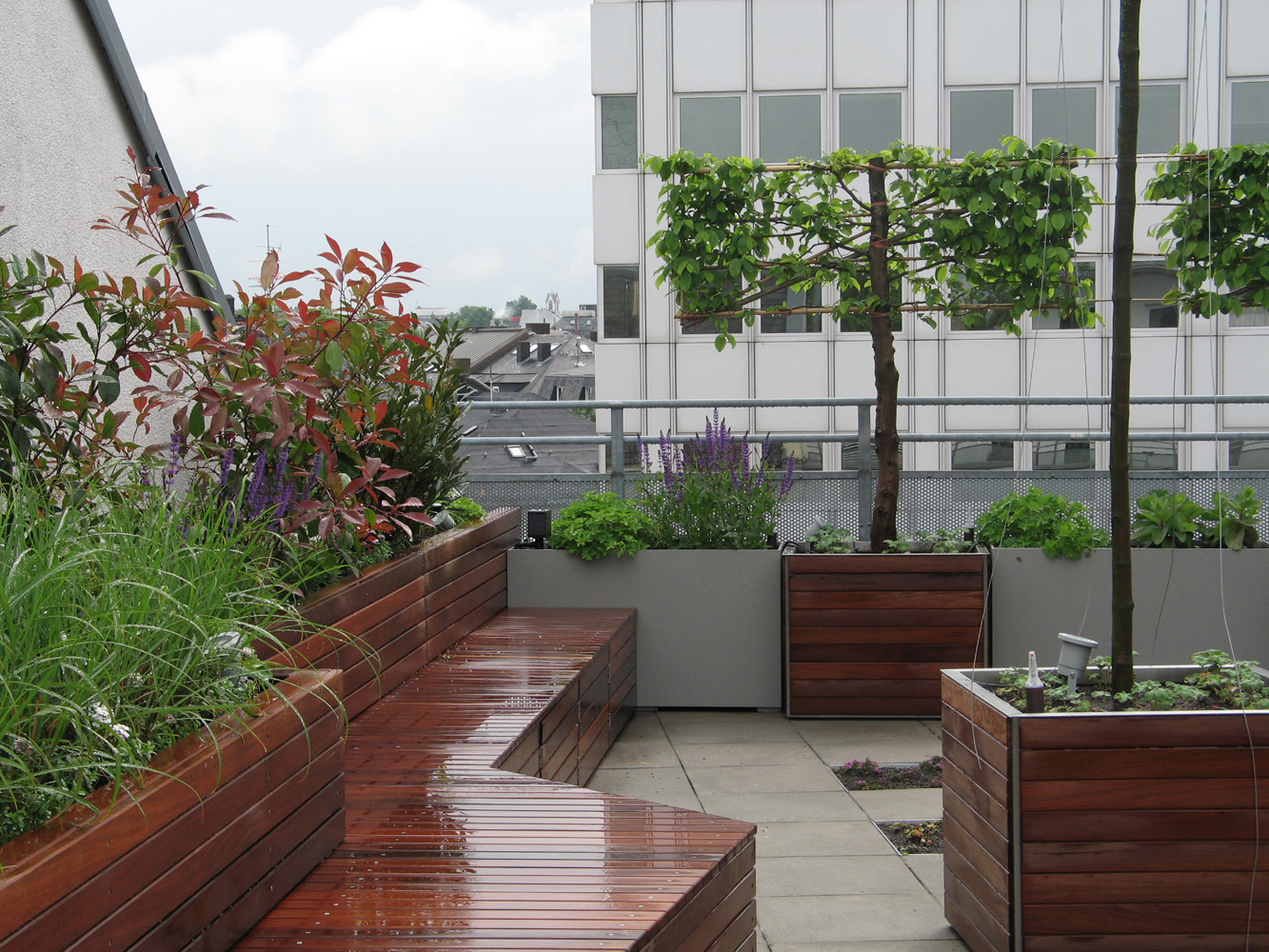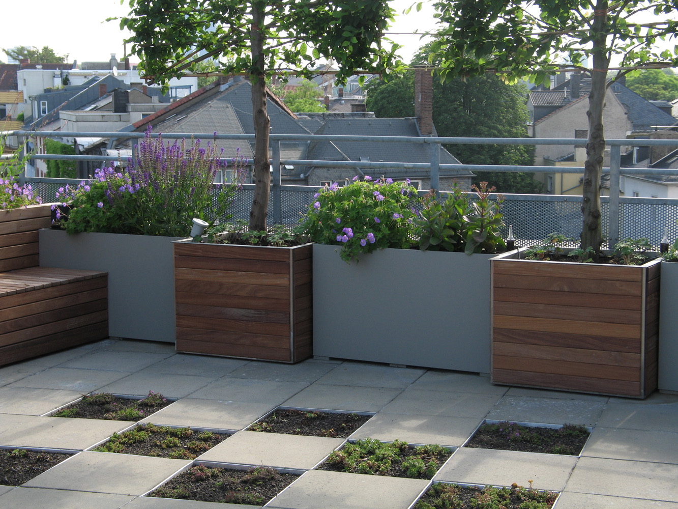 geschnittene Eibenheckenelemente mit den Hochstamm Säulenhainbuchen wirken als prägende und gestalterische Elemente im Vorgarten. Die Balkone sind mit Holz belegt. Pflanzbehälter aus dem gleichen Holz bieten in Verbindung mit der dekorativen Bepflanzung einen attraktiven Sichtschutz. Der Blick von der formal gestalteten Dachterrasse