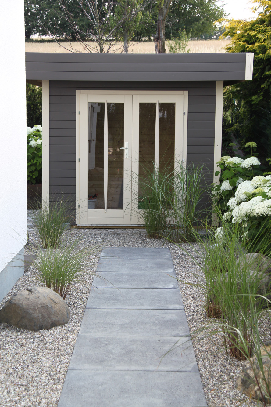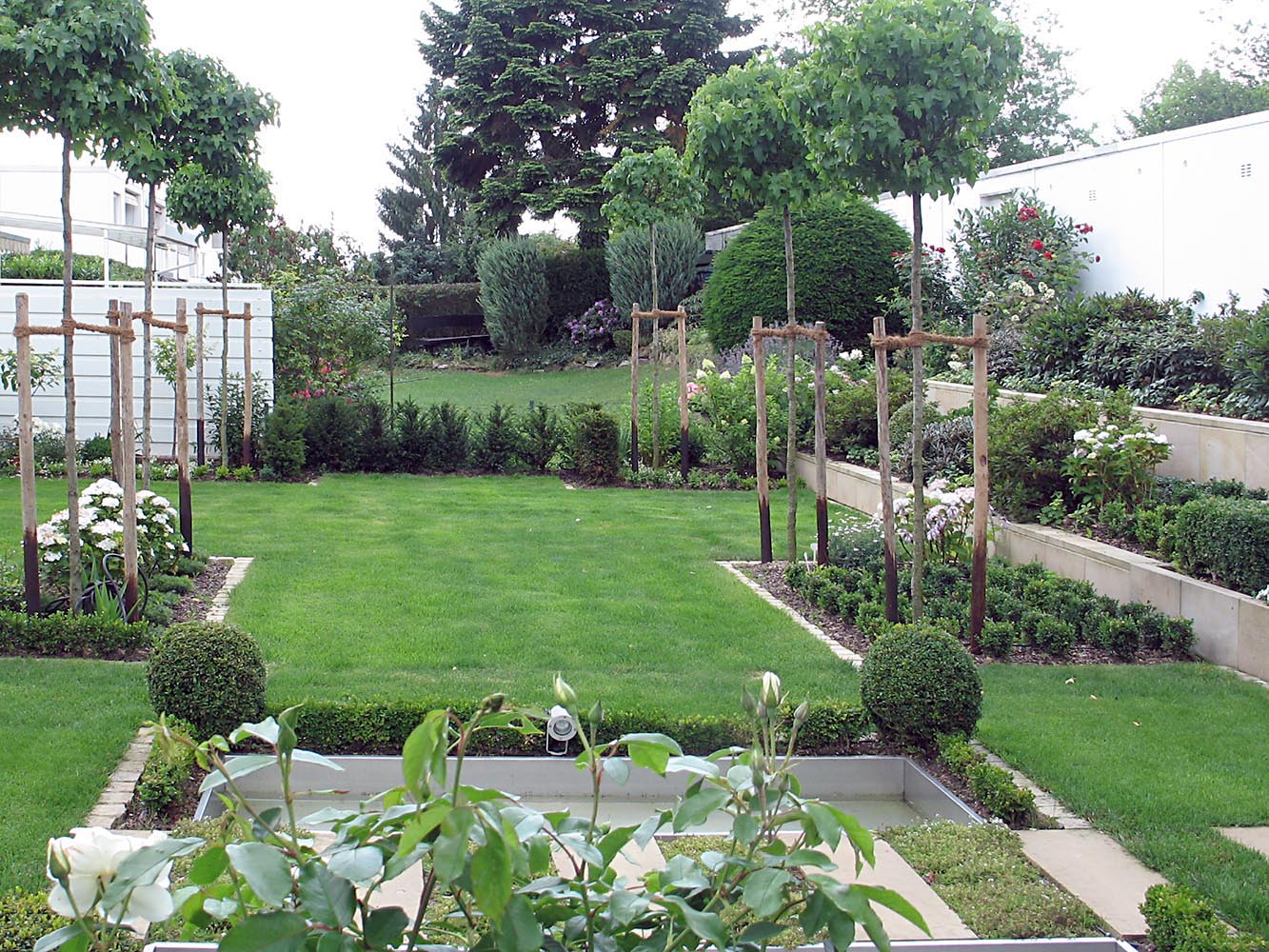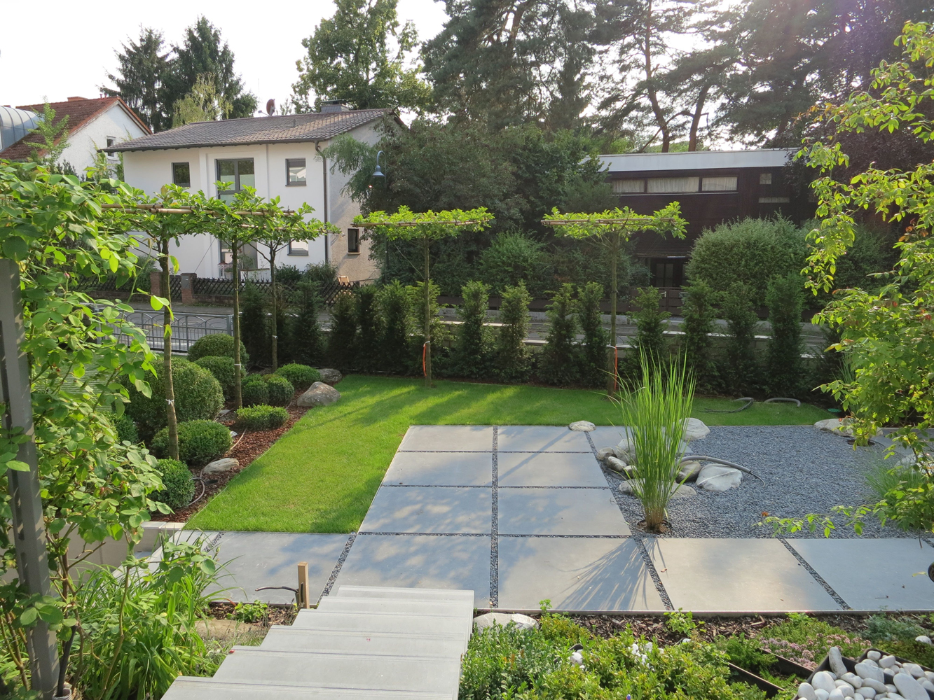 Die gartenbegeisterte Bauherren wünschten die Vollendung ihres Gartens als modernen Garten. Die dachförmig geschnittenen Magnolien bilden den Rahmen für einen neuen Gartenraum.