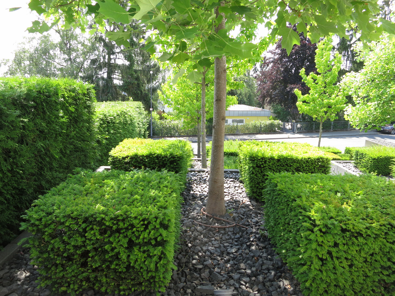 Der Vorgarten wurde mit einer großzügigen Treppenanlage die drei Terrassenebenen teilt, neu strukturiert. Verbindende Elemente sind geschnittene Eibenquader und Tulpenbäume. Dunkle Platten aus Betonstein und Basaltschotter unterstreichen die klare Vegetationsstrukturen und setzen wunderbare Akzente. Kleine Strahler illuminiern die Bäume in den Abendstunden und Wandleuchten in den Mauern beleuchten die Treppenanlage. Dezenten Entwässerungsrinnen leiten das Niederschlagswasser sichr ab.