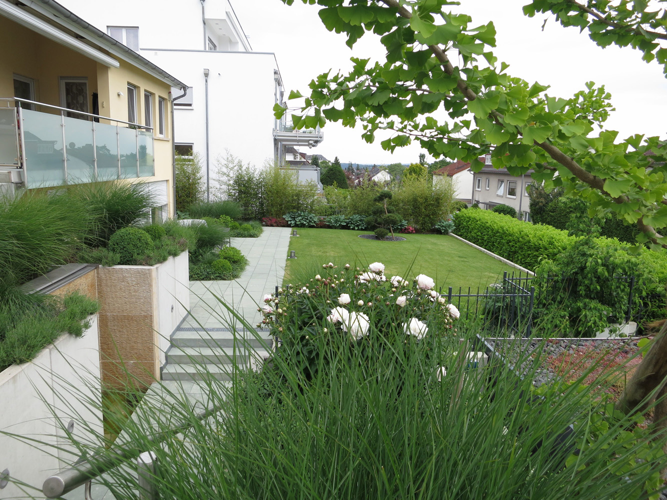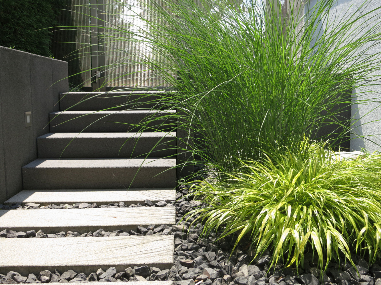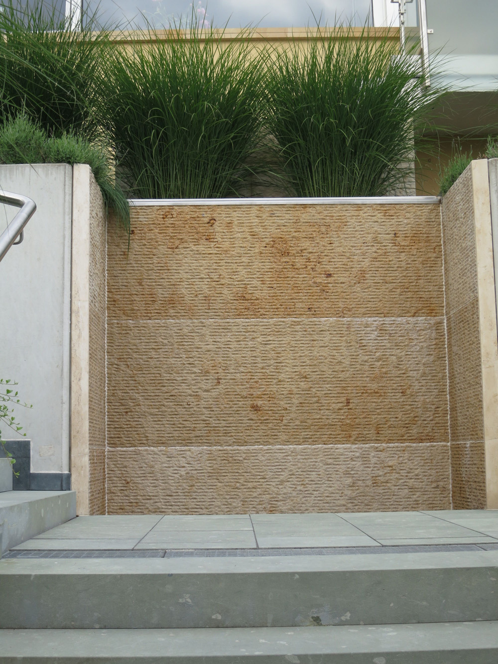Der Vorgarten wurde angehoben um den Garten zu vergrößern. Eine neue Ebene wurde geschaffen. Mit hochwertigem Naturstein wurden die Treppen, Terrassen und Wege belegt. Hochgestellte Krustensteine und dazwischen Solitärgräser bieten einen interessanten Sichtschutz zum Nachbarn. Im Eingangsbereich wird man von einer Wasserwand empfangen, ein Wasserfilm überzieht die gerillte Sandsteinplatte, zu hören ist ein angenehm leises Wasserrauschen. Solitärgehölze und Gräser setzen wunderbare Akzente in dem modernen Garten.