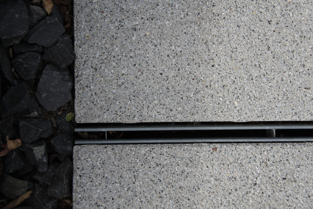 Die lineare Gliederung des Vorgartens ergibt sich aus der Architektur und der notwendigen Zugänge und Zufahrten. Über die jeweils auf der rechten und linken Seite des Grundstücks befindlichen Treppenanlagen erreicht man die Eingänge der zwei Wohnungen in den unteren Geschossen sowie den hinteren Garten. Eine durchgängige Holzstufe