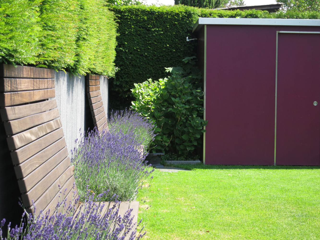 Die klaren Formgebung wurde auch im hintern Garten fortgeführt. Rechteckige Rasenflächen und Vegetationsbereiche mit wirkungsvollen Pflanzen wie Lavendel, Gräser und Hortensien lassen den kleinen Garten größer wirken. Die Holzbänke sind als Gestaltungselement in die Mauer integriert und wurden für diesen Garten entworfen. Blickpunkt setzt ein farbiges Gartenhaus in der grünen Pflanzung. Die Vegetation wird automatisch bewässert und der Rasenroboter übernimmt den Rasenschnitt.