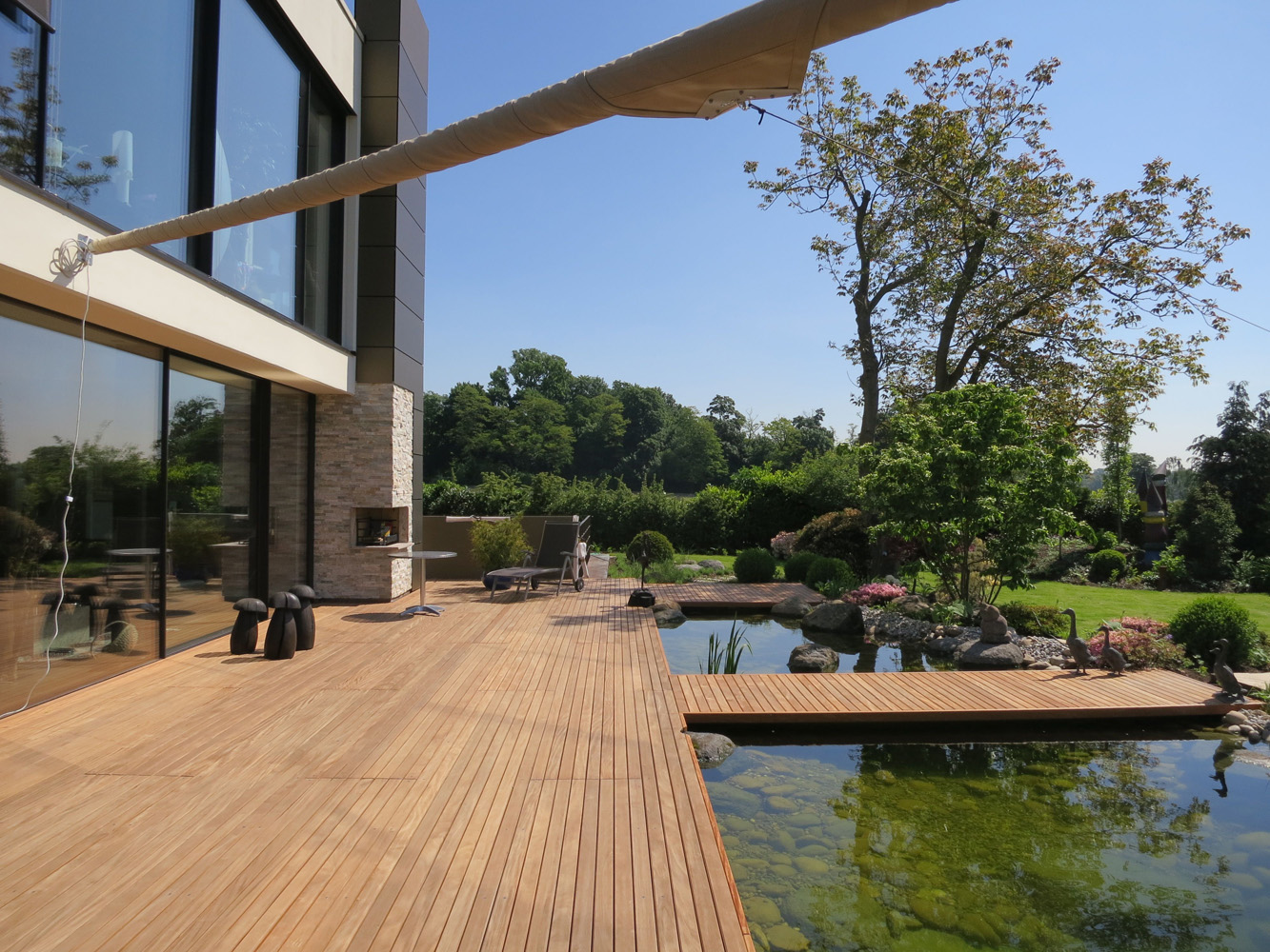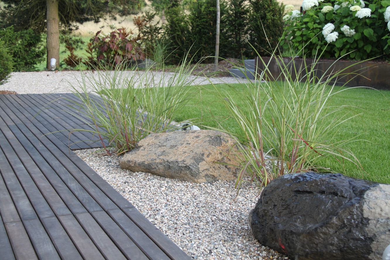Durch eine entschiedene Gliederung des Gartens sind Gartenräume mit unterschiedlichen Aufenthaltsqualitäten entstanden. Mit den Strukturen aus Grün, Holz, Wasser, Stein und Kies erhält jeder Bereich seine individuelle Note. Bäume, Hecken und Solitärgehölze stärken die dritte Dimension des Gartens.