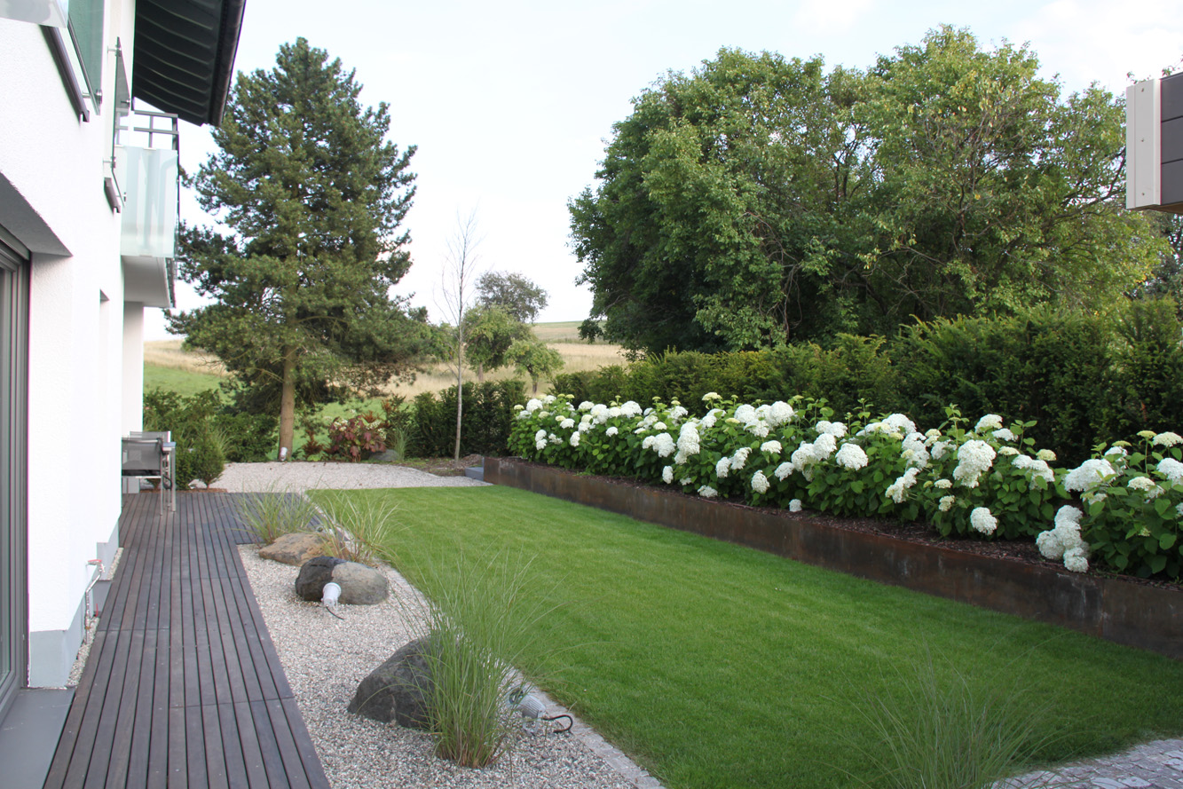 Aus einem dunklen Garten aus den 1970 Jahren, wurde ein luftiger moderner Garten, mit klaren Strukturen und interessanten Materialien wie Cortenstahl, Muschelkalk und ein Holzdeck welches mit dem Holz im Innenbereich korrespondiert. Ein Quellstein und Solitärgräser bringen Leben in den Kiesstreifen. Die Materialien und die Pflanzen sind bewusst schlicht gehalten. Eine gewisse Üppigkeit der Ballhortensien ist gewünscht und bietet im Sommer einen schönen Kontrast zu den dunkelgrünen Eibenhecken. Die Beleuchtung setzt Akzente im Garten und illuminiert die Solitärbäume.