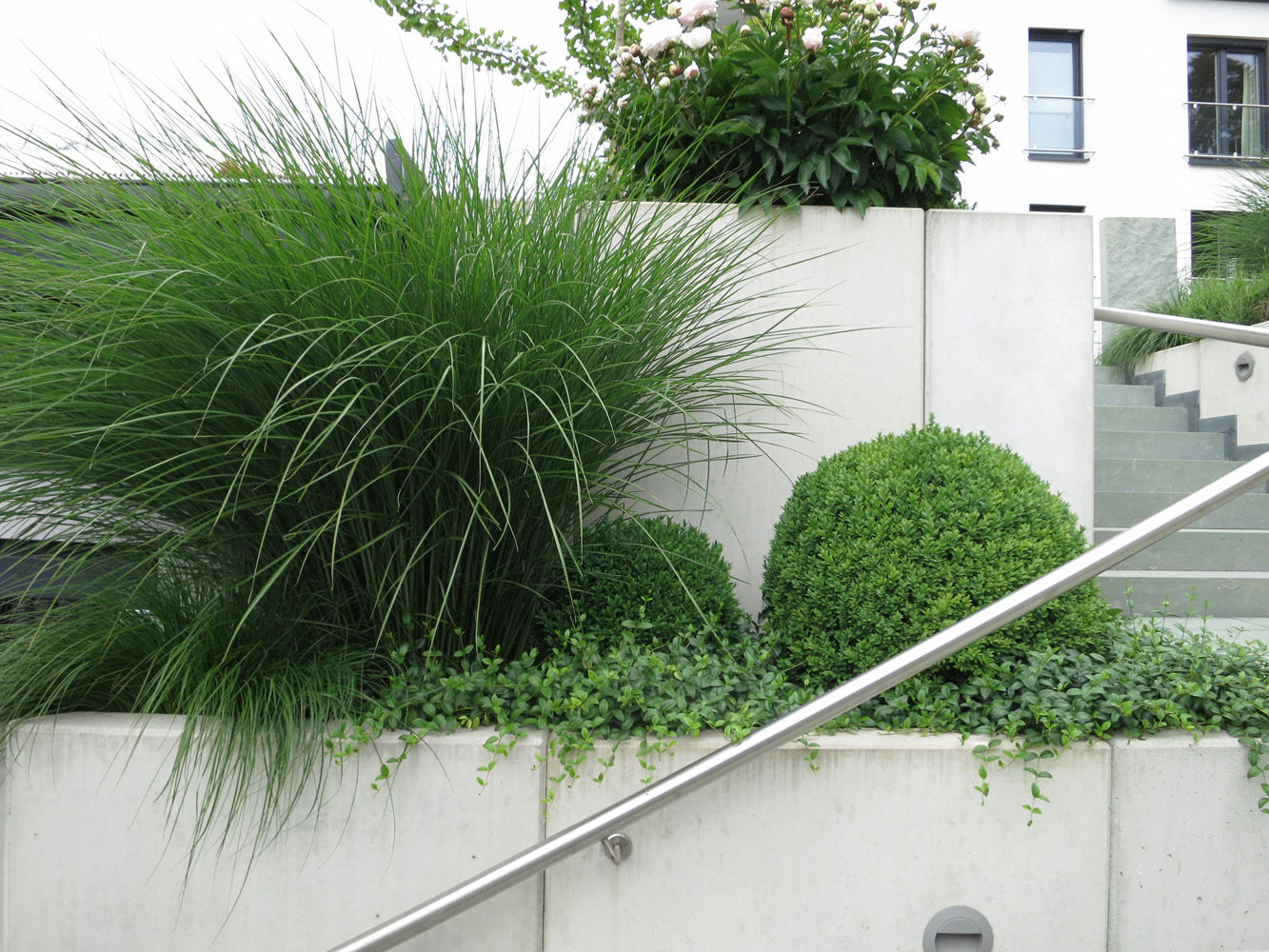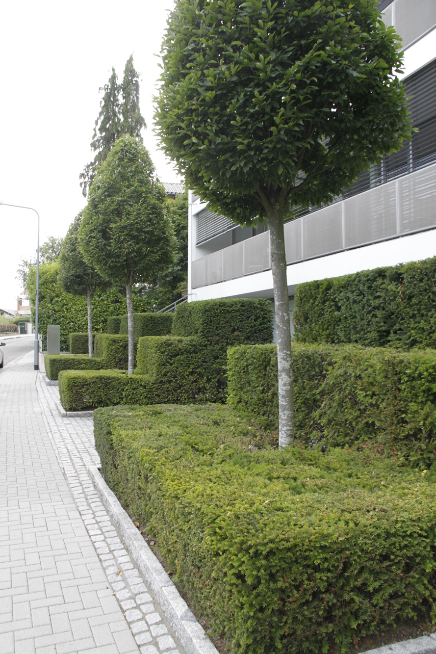 geschnittene Eibenheckenelemente mit den Hochstamm Säulenhainbuchen wirken als prägende und gestalterische Elemente im Vorgarten. Die Balkone sind mit Holz belegt. Pflanzbehälter aus dem gleichen Holz bieten in Verbindung mit der dekorativen Bepflanzung einen attraktiven Sichtschutz. Der Blick von der formal gestalteten Dachterrasse