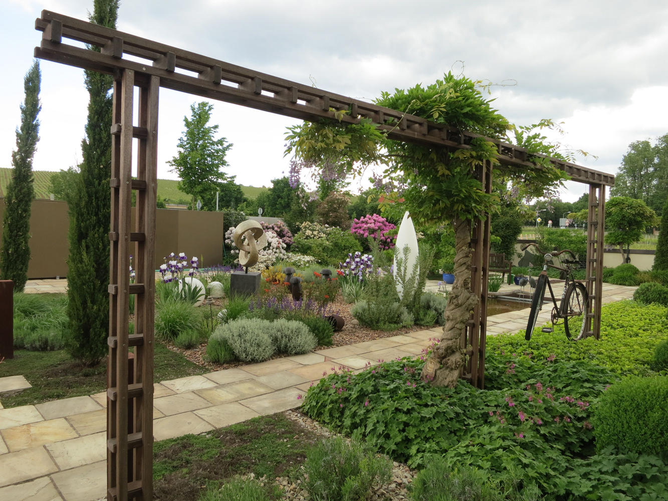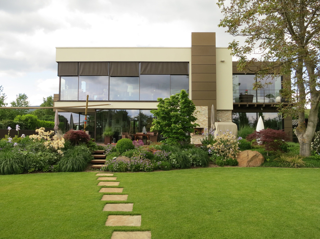 Helle Natursteinplatten, Juraschotter und Holz vermitteln mit Zypressen, Lavendel, Rosmarin und ähnlichen Kräutern ein mediterranes Flair in dem Rheingauer Garten. Sonnensegel, Beleuchtung, automatische Bewässerung und ein Rasenroboter werden mit einer aufwändigen Haustechnik gesteuert und erleichtern die Bedienung und Nutzung.