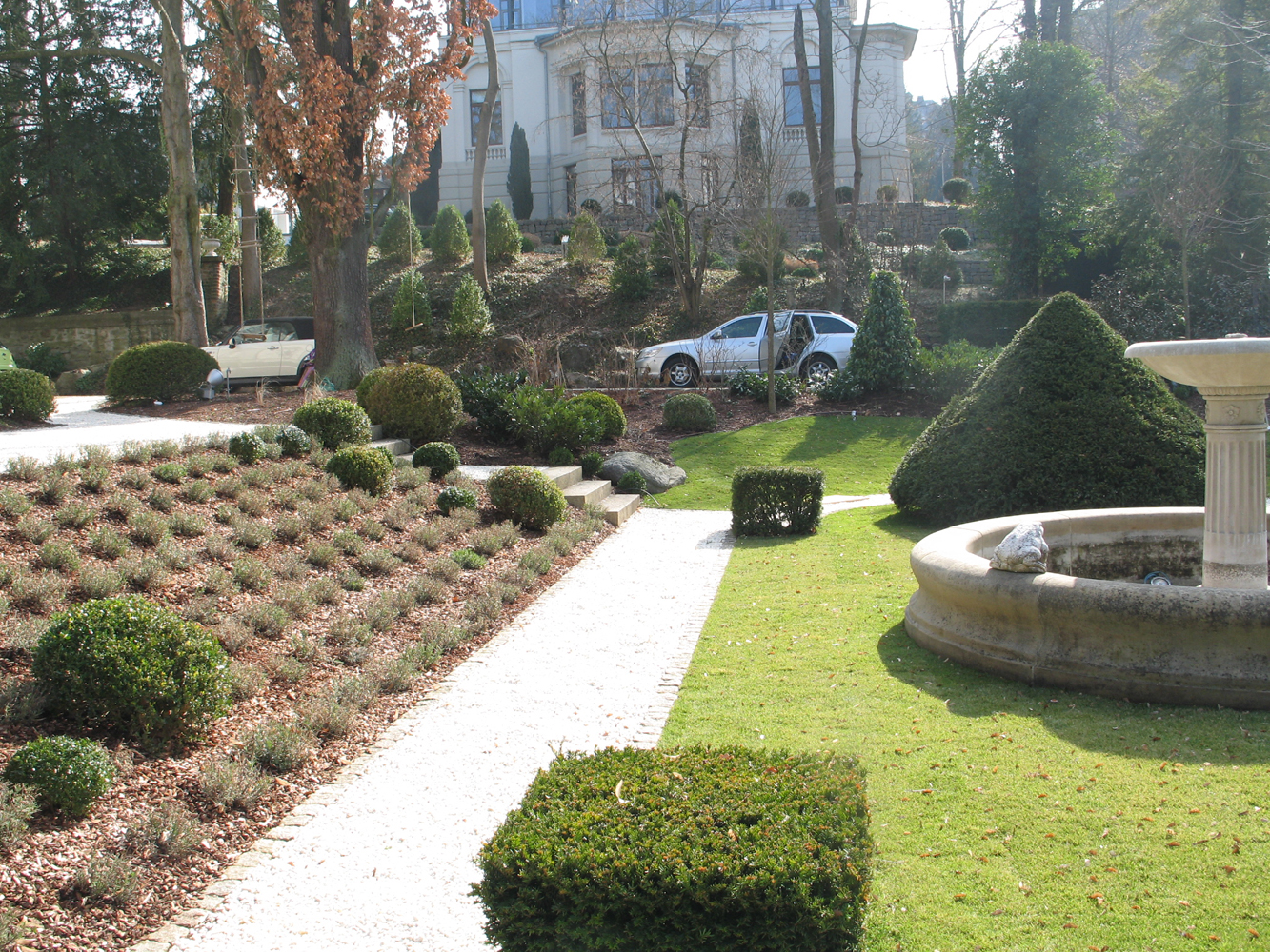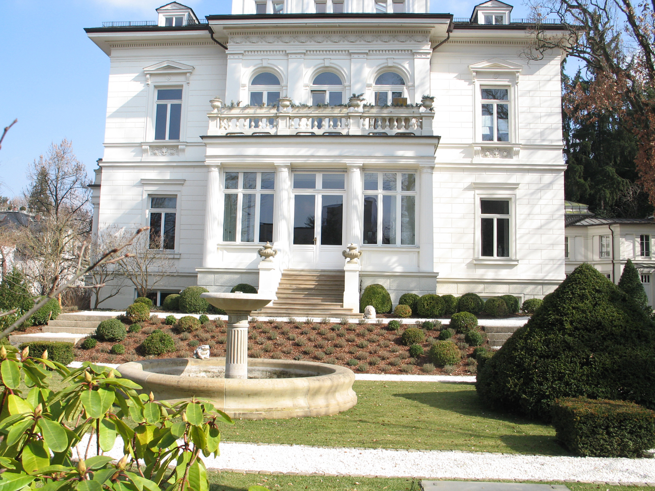 Der Garten der denkmalgeschützten Villa wurde aufgrund starker Vernässung über der Tiefgarage bautechnisch auf den neusten Stand der Technik gebracht. Die Gartenanlage die ebenflass dem Denkmalschutz unterliegen wurde nicht verändert. Die Entwässerung über der Tiefgarage und die Tragschichten der Wege wurde komplett überarbeitet. Die Pflanzflächen sind überarbeitet worden und in Teilen wurden Neuanpflanzunegn notwendig. Heute werden die Vegetationsflächen bewässert und sind somit optimal versorgt. Die Beleuchtung der Villa und der Gartenanlage wurde von Lichtblick geplant, heute ist für jeden Anlass die perfekte Lichtinzenierung möglich.