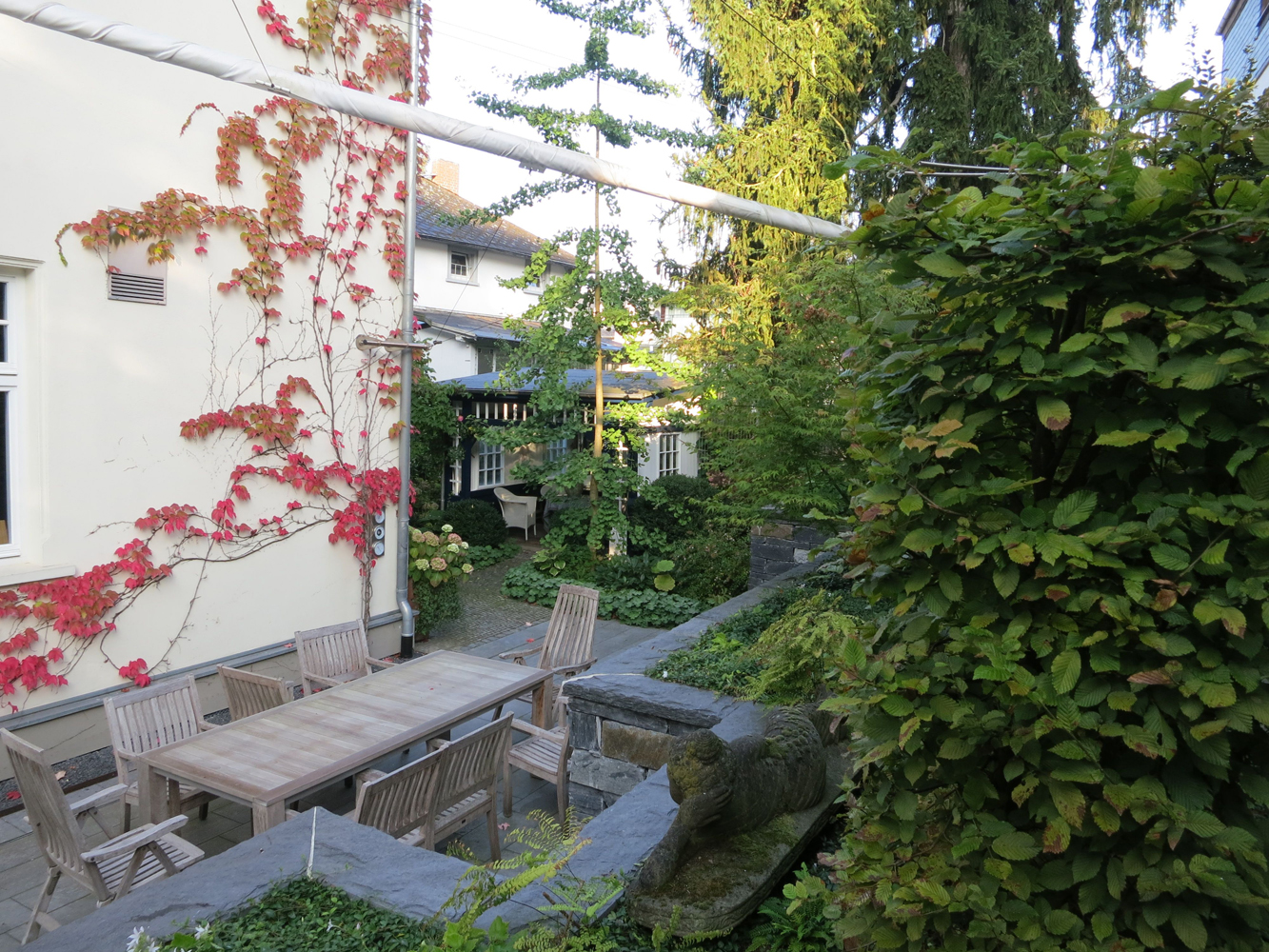 Der verwilderte Hanggarten des denkmalgeschützten Gebäudes wurde 2012 komplett umgestaltet. Alte Mauern und Terrassenbeläge wurden abgebrochen und neu gestaltet. Wichtige Bäume, Gehölze und ein kleiner Gartenpavillon wurden erhalten und in das neue Gartenkonzept integriert. Der kleine Hanggarten wurde klar und formal strukturiert. Für die Gestaltung der Mauern, Treppen und Terrassen wurde Theumaer Fruchtschiefer verwendet. Das schöne Farbspiel der Mauersteine bringt Lebendigkeit in den Garten. Einzigartig Wasserbecken integriert und ist ein Highlight in dem kleinen Garten. Eine aufwändige Wassertechnik garantiert glasklares Wasser und einen einwandfreien kleinen Wasserfall über die Edelstahlschütte. Die untere Mauer wird durch eine großzügige Treppenanlage unterbrochen, über die der obere kleine und sonnige Gartenteil erschlossen wird. Der kleine, runde mit Basalt gepflastererte Sitzplatz ist mit einer kleinen Sitzmauer eingerahmt, dahinter wachsen üppige Küchenkräuter. Von der oberen Terrasse hat man einen Blick auf den Garten mit seiner dichten abwechslungsreichen Bepflanzung. Eine wunderschöne liegende Buddhastatur wurde während der Bauphase sorgsam geschützt gelagert und später an ihrem neuen Platz perfekt in Szene gesetzt. Boden- und Mauereinbauleuchten, sowie dezente Strahler beleuchten den Garten in den Abendstunden und verzaubern Pflanzen, Mauern und Gartendetails.