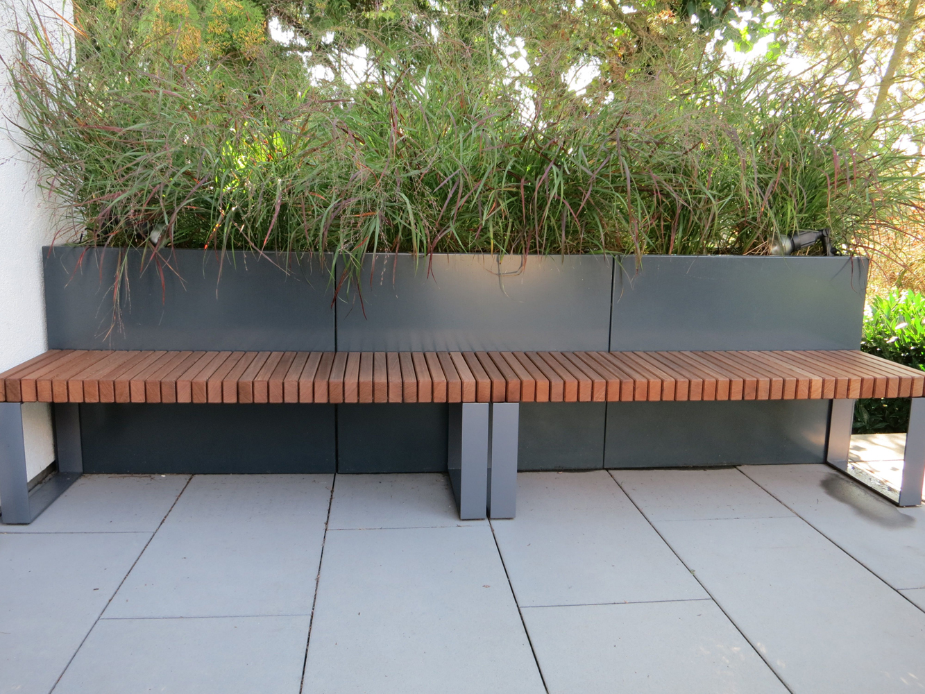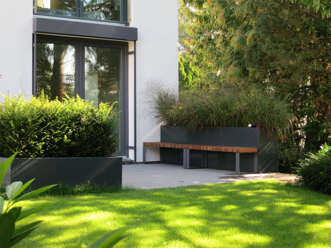 Nach dem Umbau des Hauses wurde auch der Vorgarten und Garten modern und zeitgemäß umgestaltet. Großformatige Betonsteinplatten, Holz am Schwimmbad und eine klare Pflanzung unterstreichen den moderenen Charakter des Gartens. Pflanzbehälter aus Aluminium mit einfachen Holzbänken gliedern den großen Terrassenbereich vor dem Gebäude. Das vorhandene Schwimmbad hat durch den Abriss von Mauern an der Terrasse eine neue Aufenthaltsqualität erhalten. Großzügige Sitzstufen und Treppen verbinden heute die obere Terrasse und den Schwimmbadbereich miteinander. Stufen, Sitzstufen und Terrasse aus Holz bilden eine harmonische Einheit mit dem Schwimmbad.