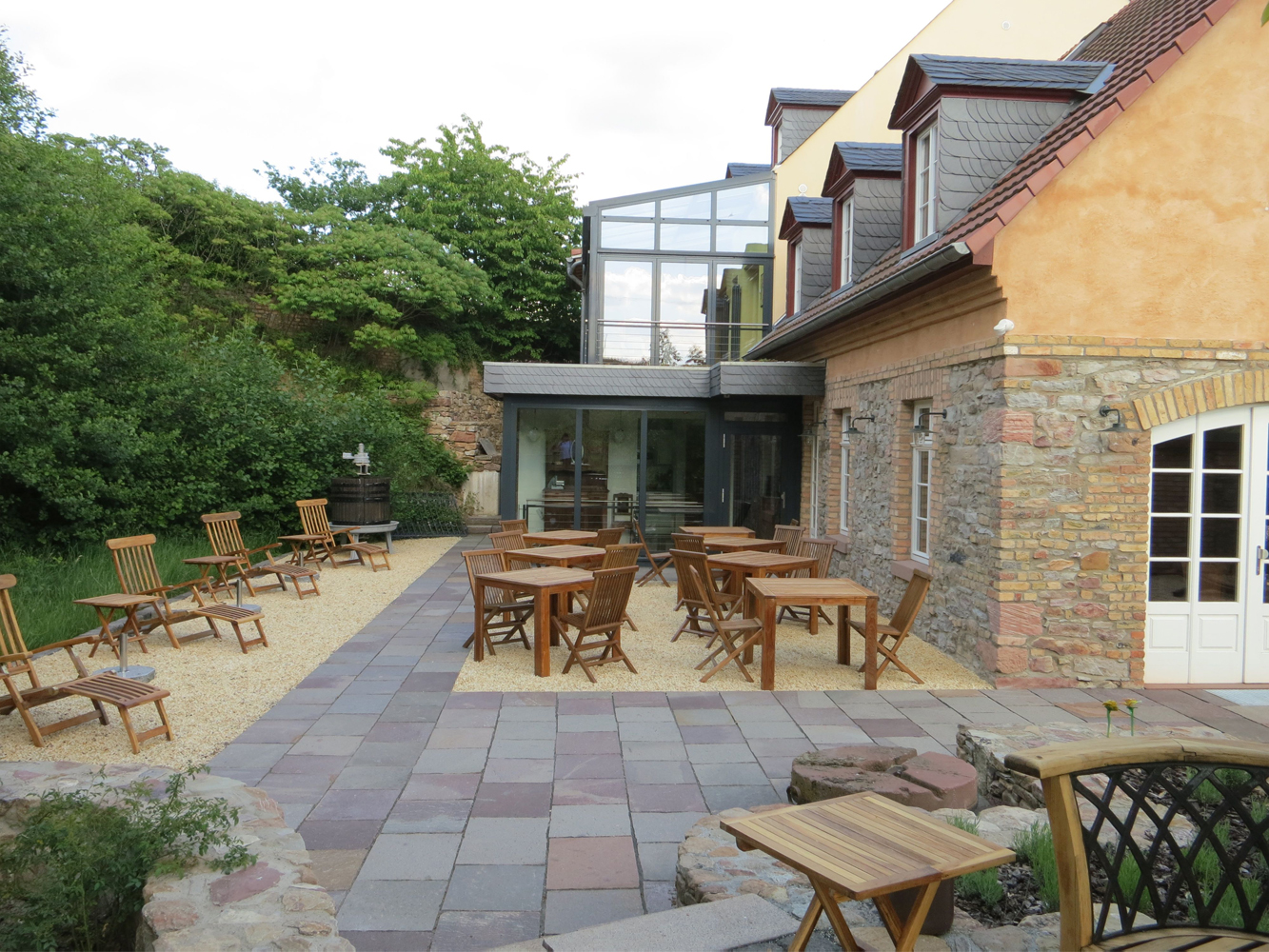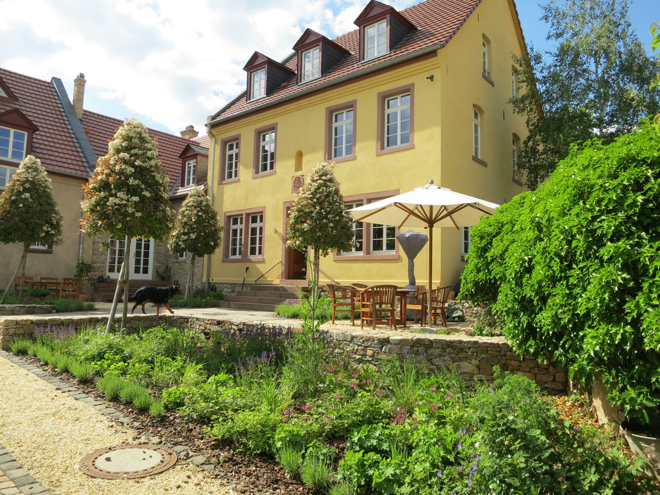 Sanierung der Gebäude und geben dem Außenraum einen unverwechelbaren Touch. Lavendelbeete und heller Schotter mit schönen Holzmöbeln unterstreichen den südländischen Charakter der Mühle und laden zum Entspannen ein. Inmitten der Weinberge liegt die Gottesthaler Mühle. Sie wurde liebvoll als Gästehaus ausgebaut. Der Garten und die Freiflächen der Mühle wurden der neuen Nutzung entsprechend umgestaltet. Eine harmonische Wechselwirkung entstand zwischen einer üppigen Pflanzenvielfalt im Garten zur Kulturlandschaft der Weinberge. Die immergrünen Bäume geben dem Garten eine ausgewogene Struktur. Natursteinmaterialien der Terrassen, Treppen und Mauern unterstreichen die aufwändige Die kleinen Terrassen der Gästezimmer liegen direkt vor Wiesen und Weinbergen und bieten zahlreiche reizvolle Ausblicke in die schöne Landschaft. Ein Löschteich wird demnächst als Schwimmbecken umgestaltet und wird mit Sicherheit das Highlight des Gartens werden.