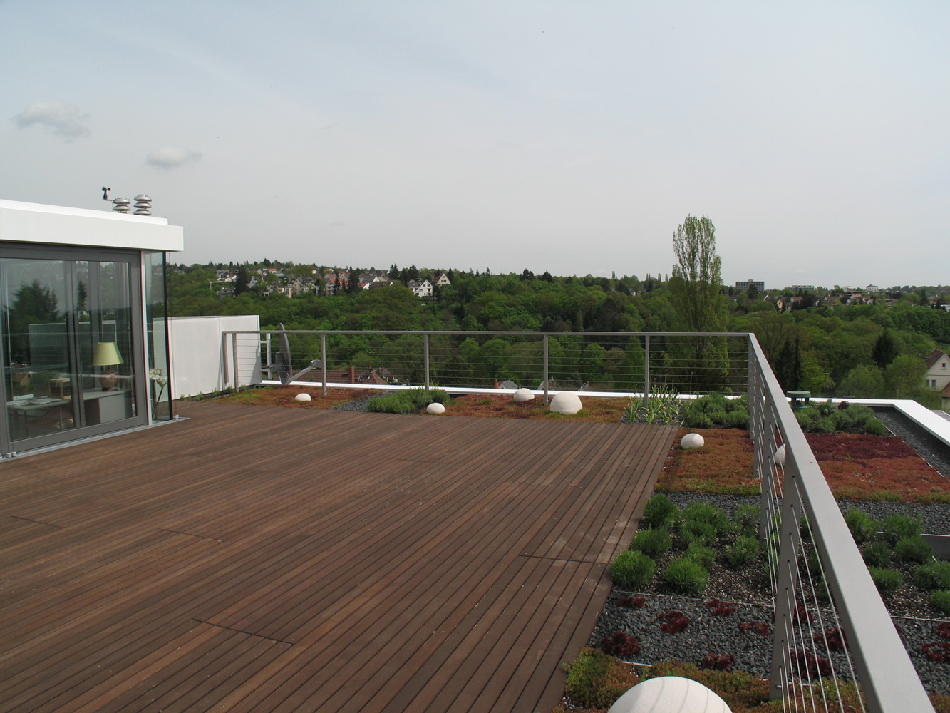 auf die Umgebung ist von allen Seiten möglich, da die extensive Bepflanzung bewusst niedrig gehalten wurde. Ein großes Holzdeck bietet Raum und Aufenthaltsqualität für alle Gelegenheiten. Die Leuchtsteine in unterschiedlichen Größen und Formen sind aus Glasfaserkunststoff und illuminieren die Dachterrasse in schönen Sommernächten.