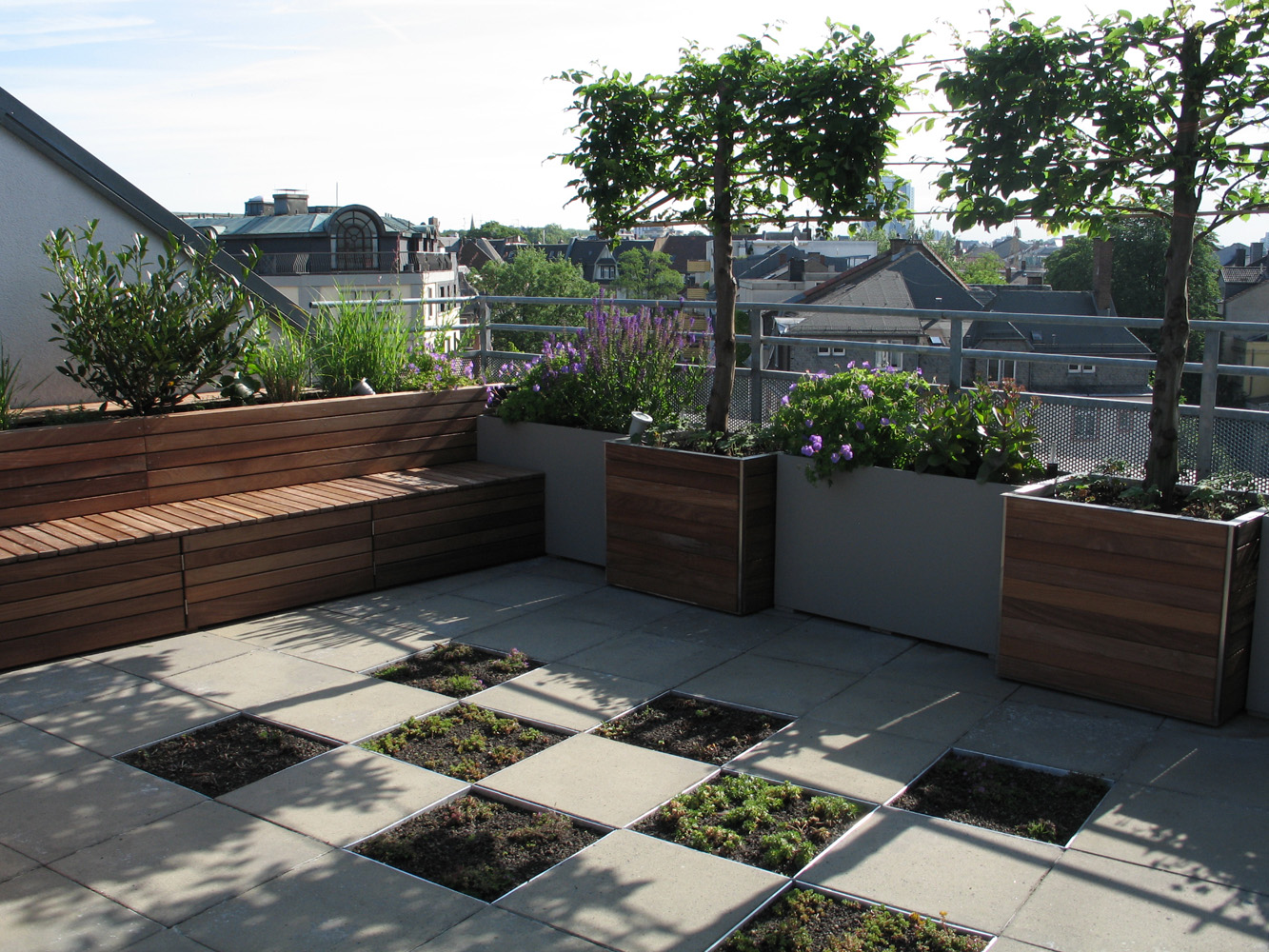 geschnittene Eibenheckenelemente mit den Hochstamm Säulenhainbuchen wirken als prägende und gestalterische Elemente im Vorgarten. Die Balkone sind mit Holz belegt. Pflanzbehälter aus dem gleichen Holz bieten in Verbindung mit der dekorativen Bepflanzung einen attraktiven Sichtschutz. Der Blick von der formal gestalteten Dachterrasse