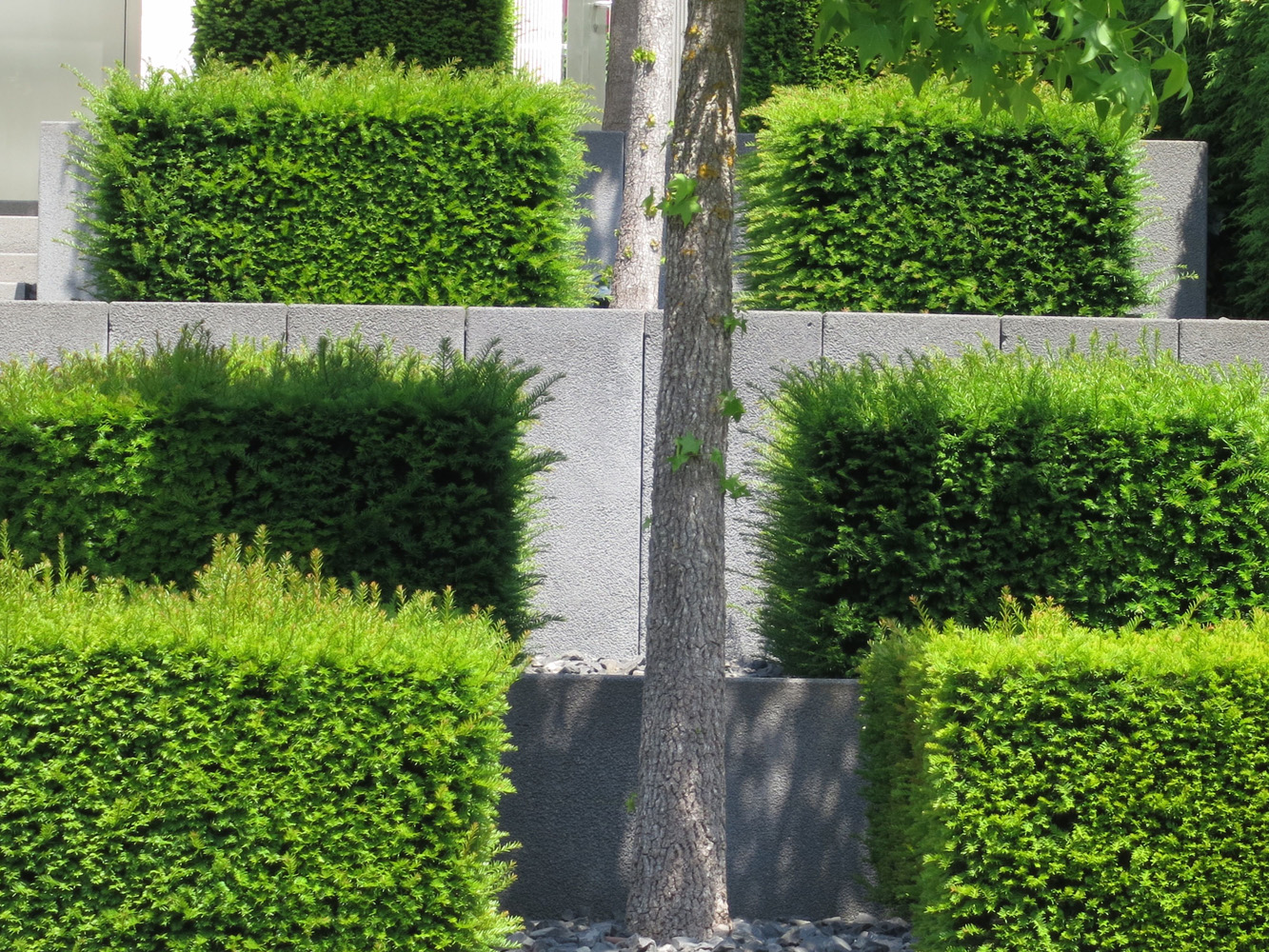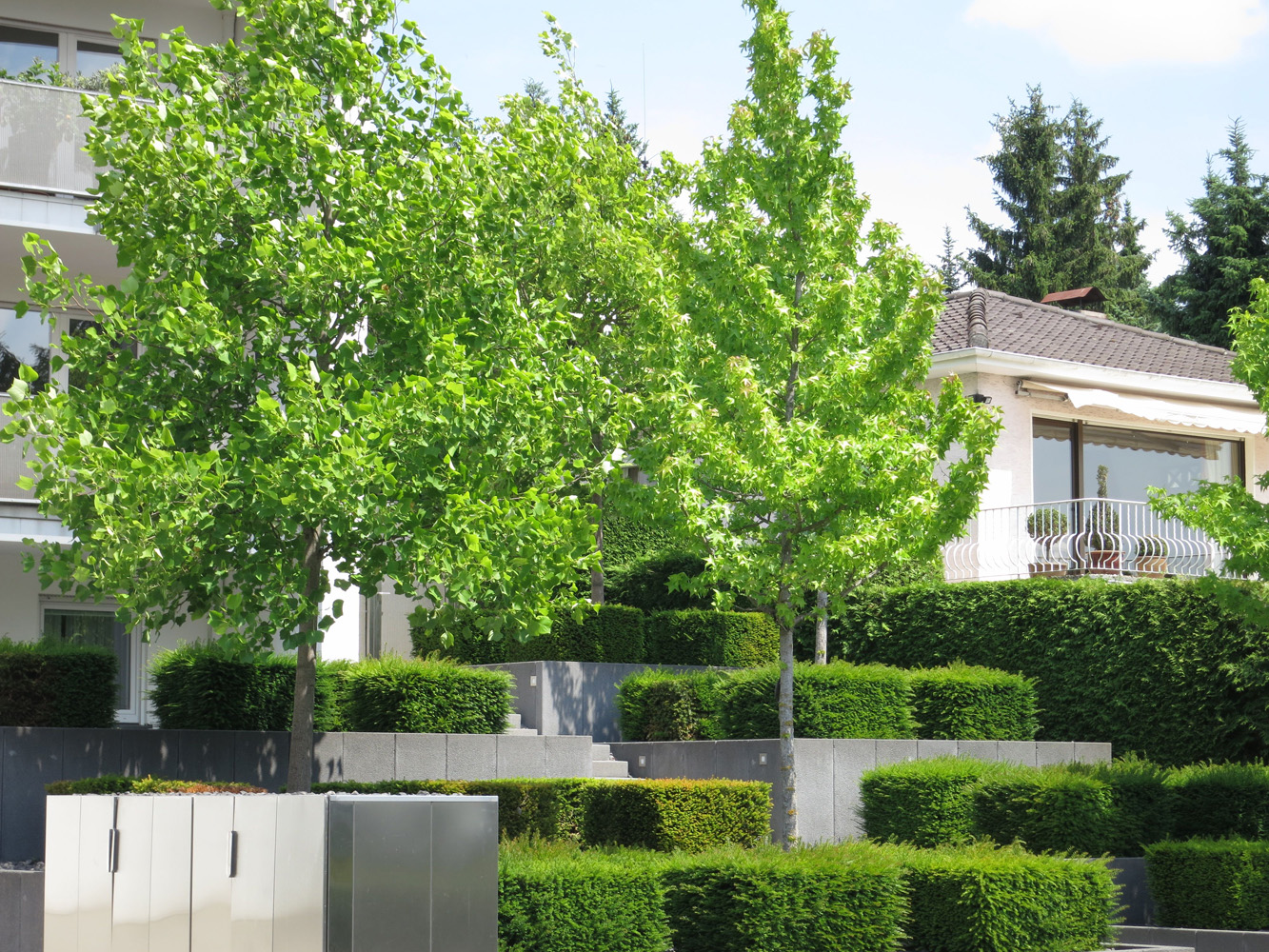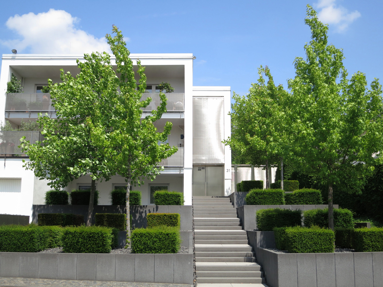 geschnittene Eibenheckenelemente mit den Hochstamm Säulenhainbuchen wirken als prägende und gestalterische Elemente im Vorgarten. Die Balkone sind mit Holz belegt. Pflanzbehälter aus dem gleichen Holz bieten in Verbindung mit der dekorativen Bepflanzung einen attraktiven Sichtschutz. Der Blick von der formal gestalteten Dachterrasse