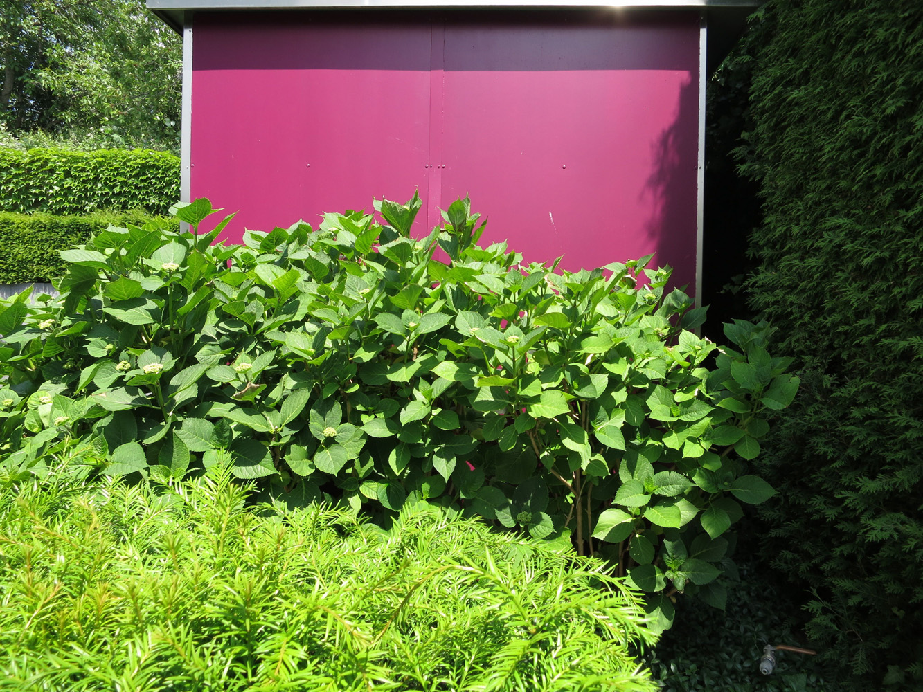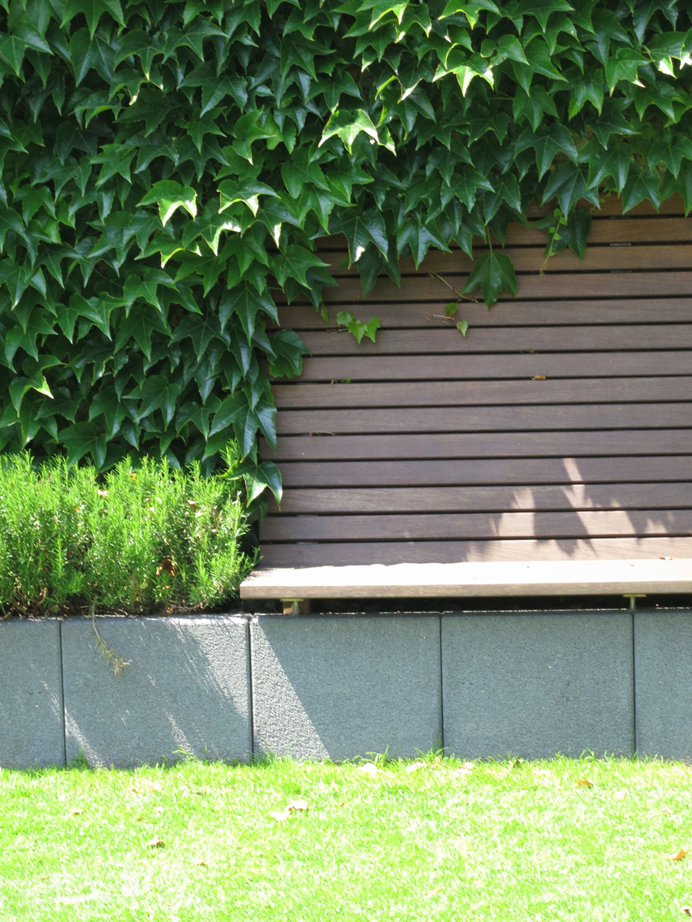 Die klaren Formgebung wurde auch im hintern Garten fortgeführt. Rechteckige Rasenflächen und Vegetationsbereiche mit wirkungsvollen Pflanzen wie Lavendel, Gräser und Hortensien lassen den kleinen Garten größer wirken. Die Holzbänke sind als Gestaltungselement in die Mauer integriert und wurden für diesen Garten entworfen. Blickpunkt setzt ein farbiges Gartenhaus in der grünen Pflanzung. Die Vegetation wird automatisch bewässert und der Rasenroboter übernimmt den Rasenschnitt.
