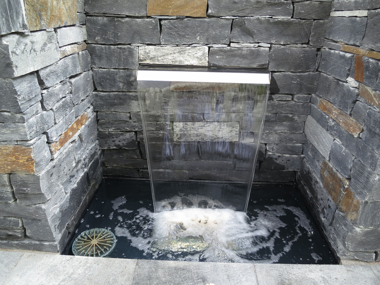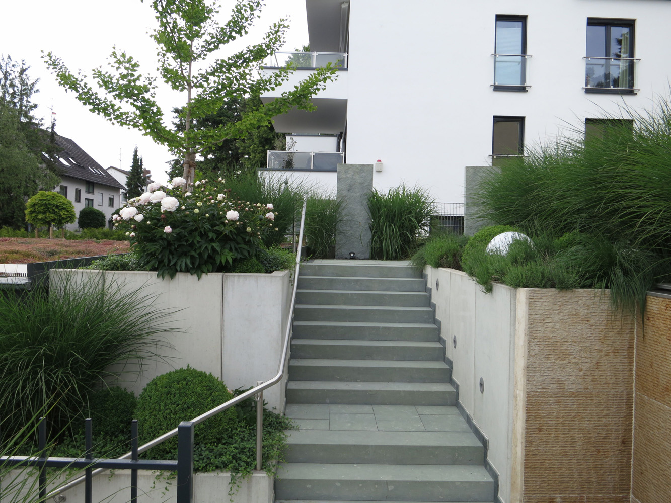 Der Vorgarten wurde angehoben um den Garten zu vergrößern. Eine neue Ebene wurde geschaffen. Mit hochwertigem Naturstein wurden die Treppen, Terrassen und Wege belegt. Hochgestellte Krustensteine und dazwischen Solitärgräser bieten einen interessanten Sichtschutz zum Nachbarn. Im Eingangsbereich wird man von einer Wasserwand empfangen, ein Wasserfilm überzieht die gerillte Sandsteinplatte, zu hören ist ein angenehm leises Wasserrauschen. Solitärgehölze und Gräser setzen wunderbare Akzente in dem modernen Garten.