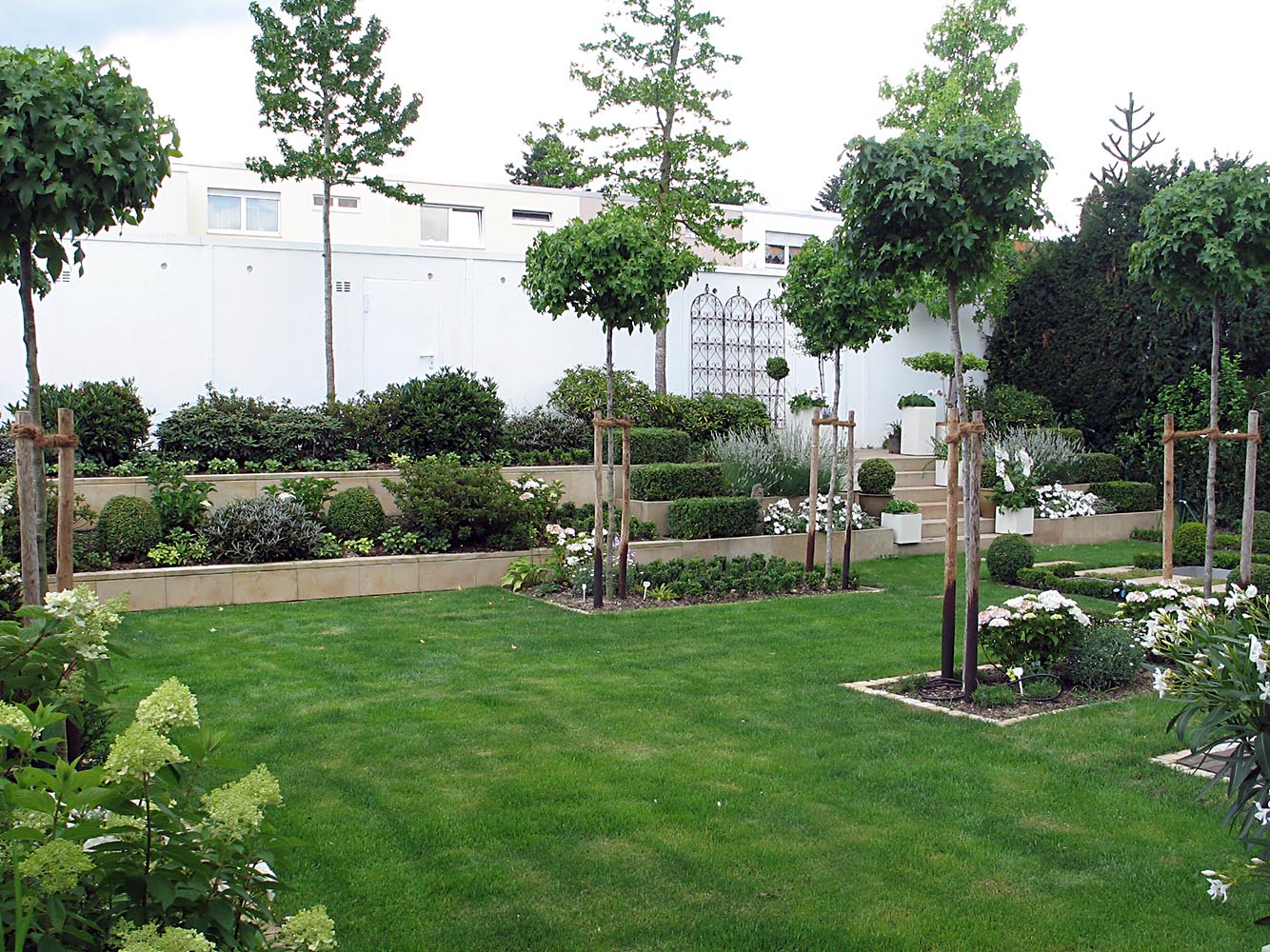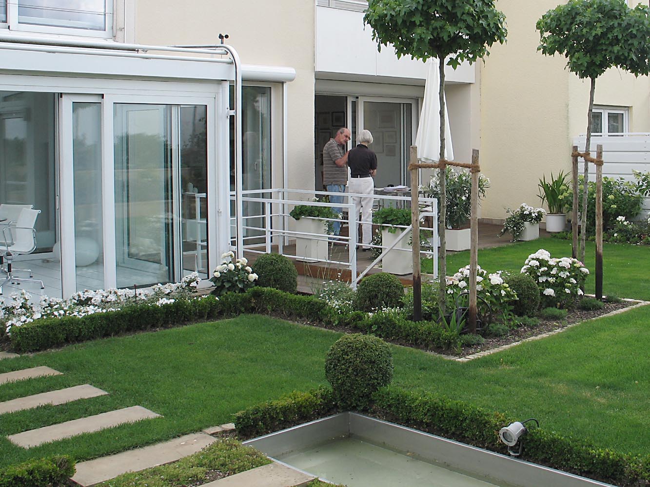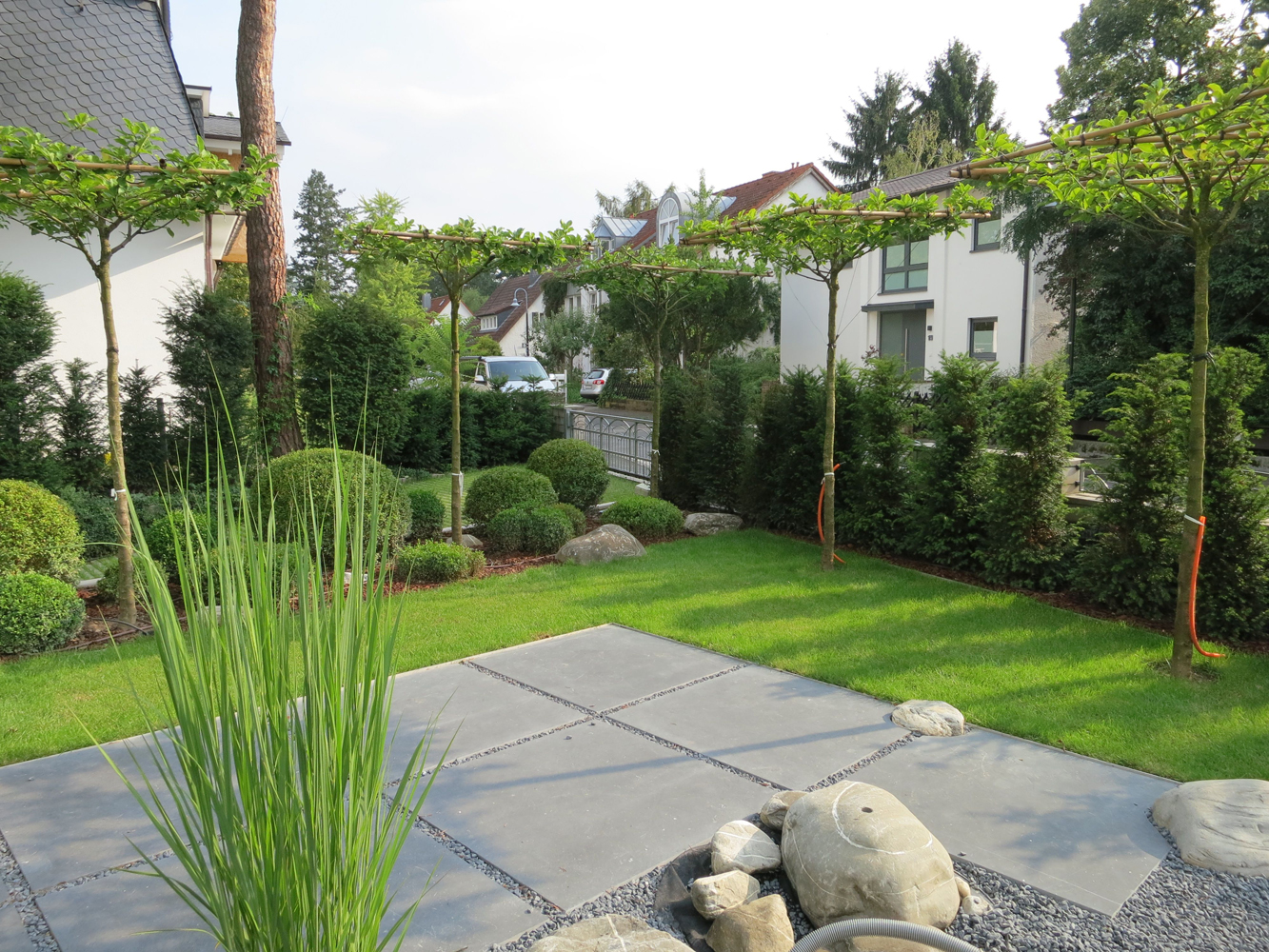 Die gartenbegeisterte Bauherren wünschten die Vollendung ihres Gartens als modernen Garten. Die dachförmig geschnittenen Magnolien bilden den Rahmen für einen neuen Gartenraum.