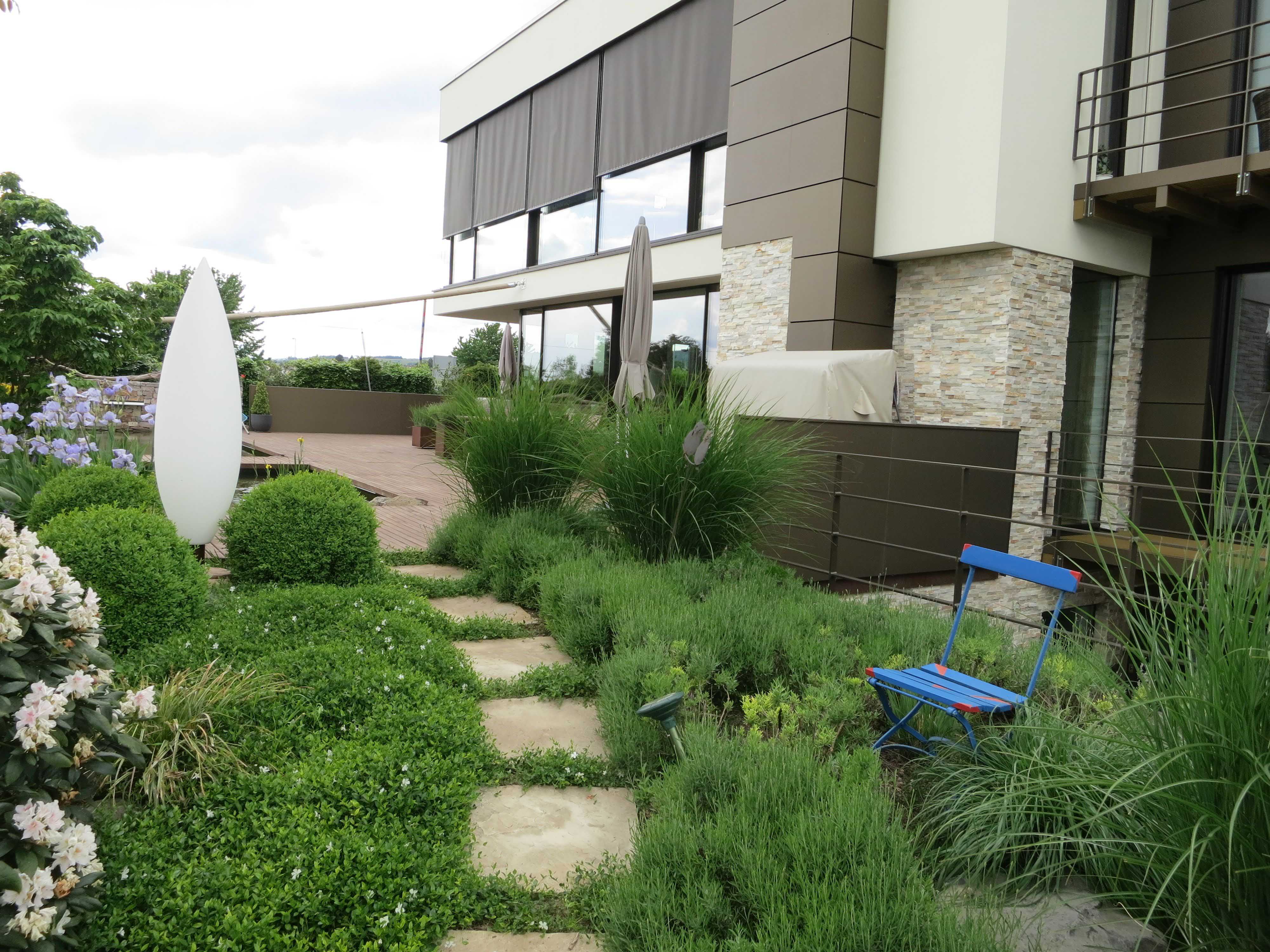 Helle Natursteinplatten, Juraschotter und Holz vermitteln mit Zypressen, Lavendel, Rosmarin und ähnlichen Kräutern ein mediterranes Flair in dem Rheingauer Garten. Sonnensegel, Beleuchtung, automatische Bewässerung und ein Rasenroboter werden mit einer aufwändigen Haustechnik gesteuert und erleichtern die Bedienung und Nutzung.