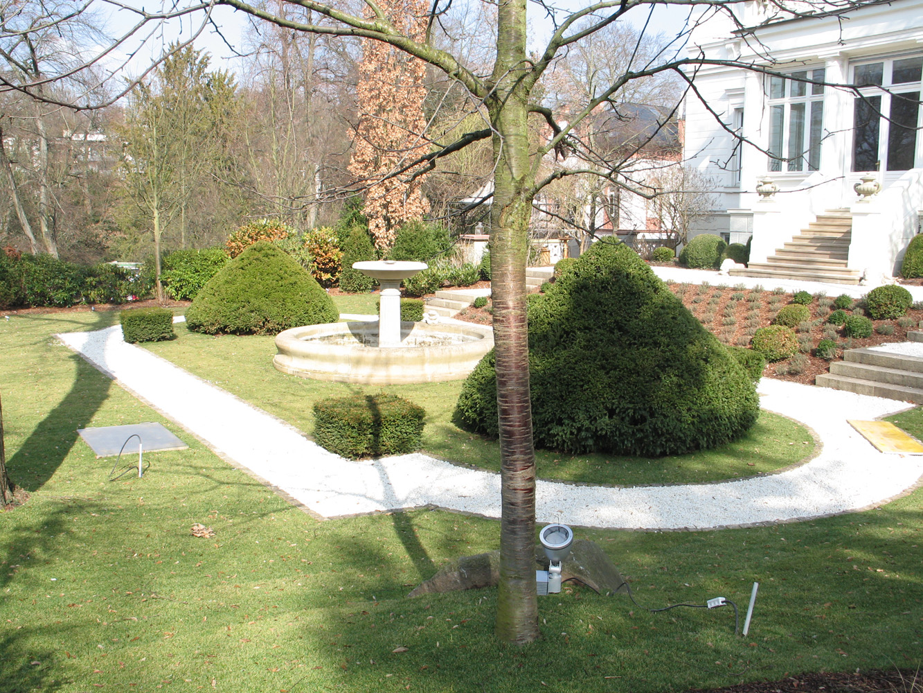 Der Garten der denkmalgeschützten Villa wurde aufgrund starker Vernässung über der Tiefgarage bautechnisch auf den neusten Stand der Technik gebracht. Die Gartenanlage die ebenflass dem Denkmalschutz unterliegen wurde nicht verändert. Die Entwässerung über der Tiefgarage und die Tragschichten der Wege wurde komplett überarbeitet. Die Pflanzflächen sind überarbeitet worden und in Teilen wurden Neuanpflanzunegn notwendig. Heute werden die Vegetationsflächen bewässert und sind somit optimal versorgt. Die Beleuchtung der Villa und der Gartenanlage wurde von Lichtblick geplant, heute ist für jeden Anlass die perfekte Lichtinzenierung möglich.