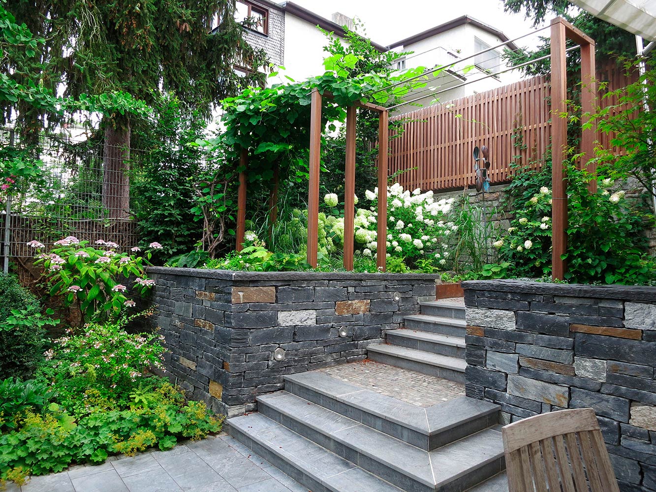 Der verwilderte Hanggarten des denkmalgeschützten Gebäudes wurde 2012 komplett umgestaltet. Alte Mauern und Terrassenbeläge wurden abgebrochen und neu gestaltet. Wichtige Bäume, Gehölze und ein kleiner Gartenpavillon wurden erhalten und in das neue Gartenkonzept integriert. Der kleine Hanggarten wurde klar und formal strukturiert. Für die Gestaltung der Mauern, Treppen und Terrassen wurde Theumaer Fruchtschiefer verwendet. Das schöne Farbspiel der Mauersteine bringt Lebendigkeit in den Garten. Einzigartig Wasserbecken integriert und ist ein Highlight in dem kleinen Garten. Eine aufwändige Wassertechnik garantiert glasklares Wasser und einen einwandfreien kleinen Wasserfall über die Edelstahlschütte. Die untere Mauer wird durch eine großzügige Treppenanlage unterbrochen, über die der obere kleine und sonnige Gartenteil erschlossen wird. Der kleine, runde mit Basalt gepflastererte Sitzplatz ist mit einer kleinen Sitzmauer eingerahmt, dahinter wachsen üppige Küchenkräuter. Von der oberen Terrasse hat man einen Blick auf den Garten mit seiner dichten abwechslungsreichen Bepflanzung. Eine wunderschöne liegende Buddhastatur wurde während der Bauphase sorgsam geschützt gelagert und später an ihrem neuen Platz perfekt in Szene gesetzt. Boden- und Mauereinbauleuchten, sowie dezente Strahler beleuchten den Garten in den Abendstunden und verzaubern Pflanzen, Mauern und Gartendetails.