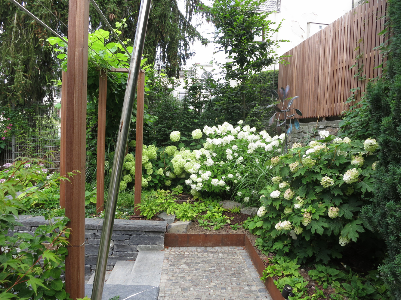 Aus einem dunklen Garten aus den 1970 Jahren, wurde ein luftiger moderner Garten, mit klaren Strukturen und interessanten Materialien wie Cortenstahl, Muschelkalk und ein Holzdeck welches mit dem Holz im Innenbereich korrespondiert. Ein Quellstein und Solitärgräser bringen Leben in den Kiesstreifen. Die Materialien und die Pflanzen sind bewusst schlicht gehalten. Eine gewisse Üppigkeit der Ballhortensien ist gewünscht und bietet im Sommer einen schönen Kontrast zu den dunkelgrünen Eibenhecken. Die Beleuchtung setzt Akzente im Garten und illuminiert die Solitärbäume.