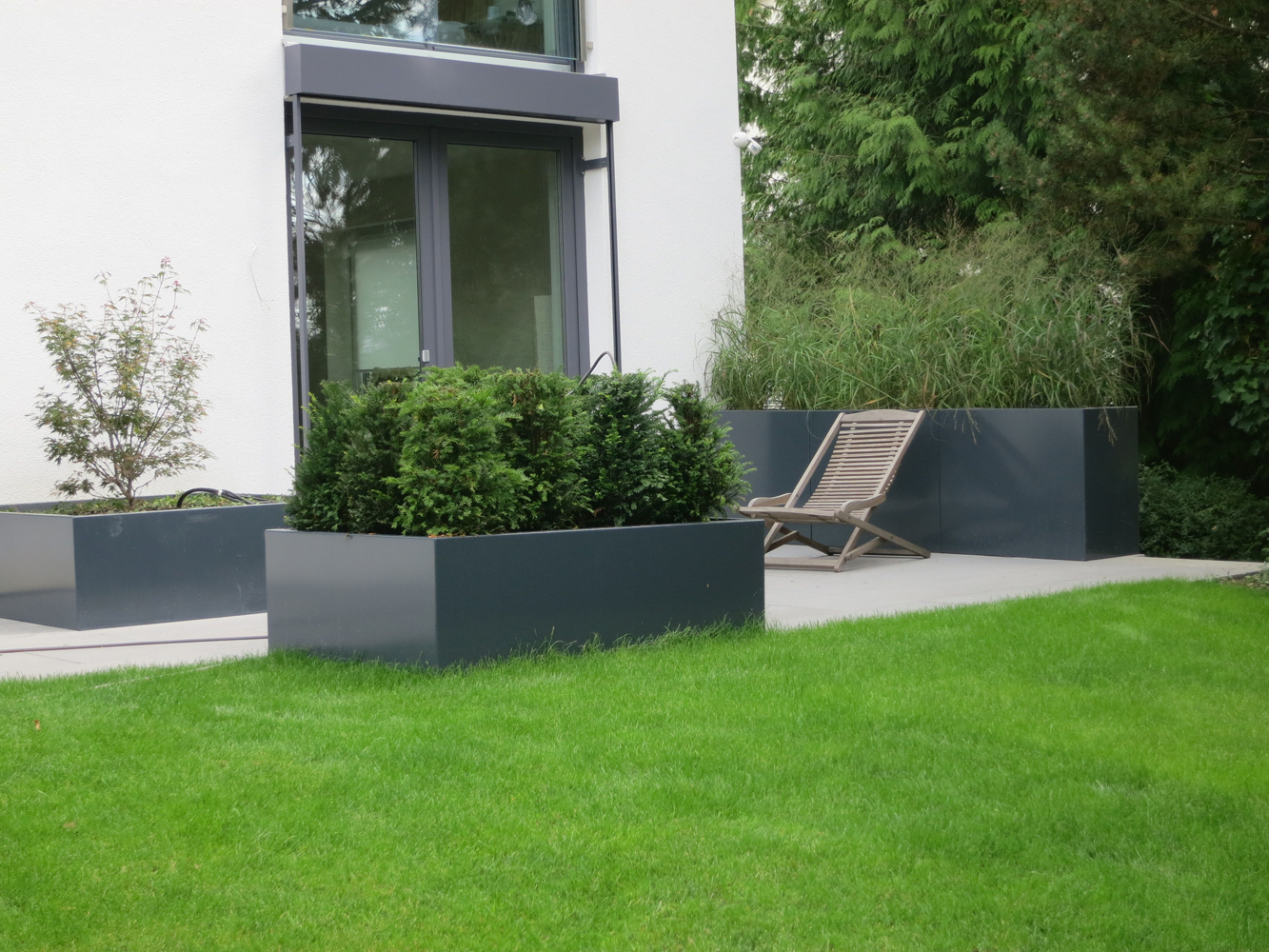 Nach dem Umbau des Hauses wurde auch der Vorgarten und Garten modern und zeitgemäß umgestaltet. Großformatige Betonsteinplatten, Holz am Schwimmbad und eine klare Pflanzung unterstreichen den moderenen Charakter des Gartens. Pflanzbehälter aus Aluminium mit einfachen Holzbänken gliedern den großen Terrassenbereich vor dem Gebäude. Das vorhandene Schwimmbad hat durch den Abriss von Mauern an der Terrasse eine neue Aufenthaltsqualität erhalten. Großzügige Sitzstufen und Treppen verbinden heute die obere Terrasse und den Schwimmbadbereich miteinander. Stufen, Sitzstufen und Terrasse aus Holz bilden eine harmonische Einheit mit dem Schwimmbad.