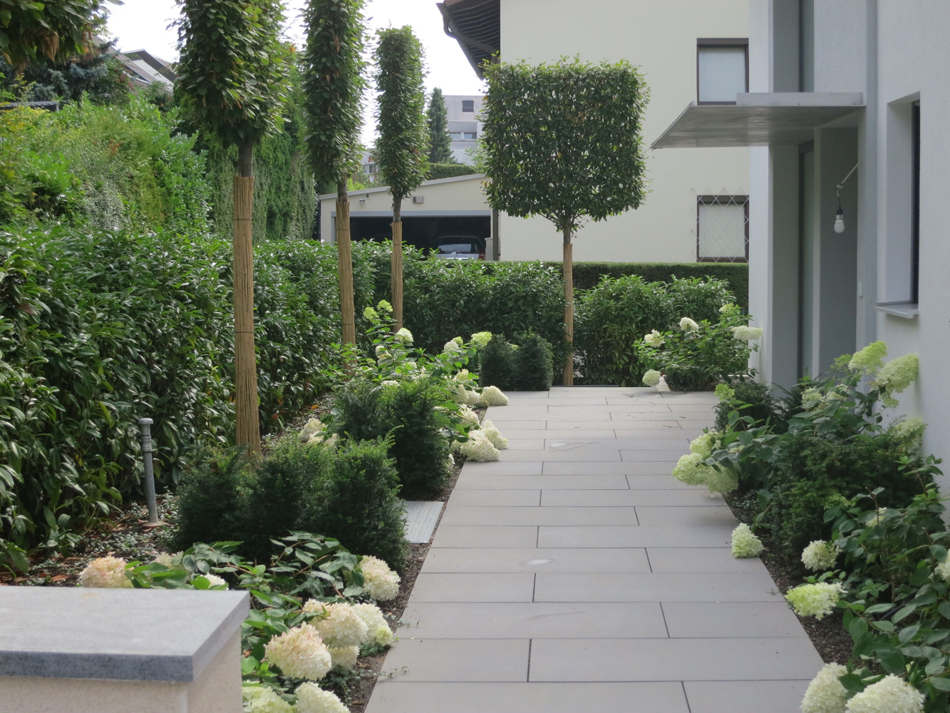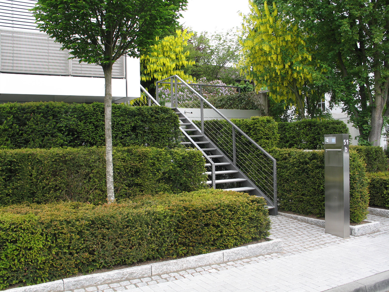 Der Vorgarten wurde mit einer großzügigen Treppenanlage die drei Terrassenebenen teilt, neu strukturiert. Verbindende Elemente sind geschnittene Eibenquader und Tulpenbäume. Dunkle Platten aus Betonstein und Basaltschotter unterstreichen die klare Vegetationsstrukturen und setzen wunderbare Akzente. Kleine Strahler illuminiern die Bäume in den Abendstunden und Wandleuchten in den Mauern beleuchten die Treppenanlage. Dezenten Entwässerungsrinnen leiten das Niederschlagswasser sichr ab.