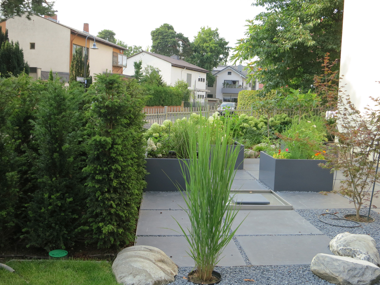 Pflanzbehälter mit Gräsern und Kräutern geben der schachbrettartig gestalteten Fläche eine dritte Dimension. Großformatige Natursteinplatten aus Blaustein, hochwertiger dunkler Kies, Findlinge, Solitärgräser, Eibenhecken und ein Buchsbeet komplettieren das Gartenbild. Kleine Wasserspiele beleben den neuen Gartenraum.