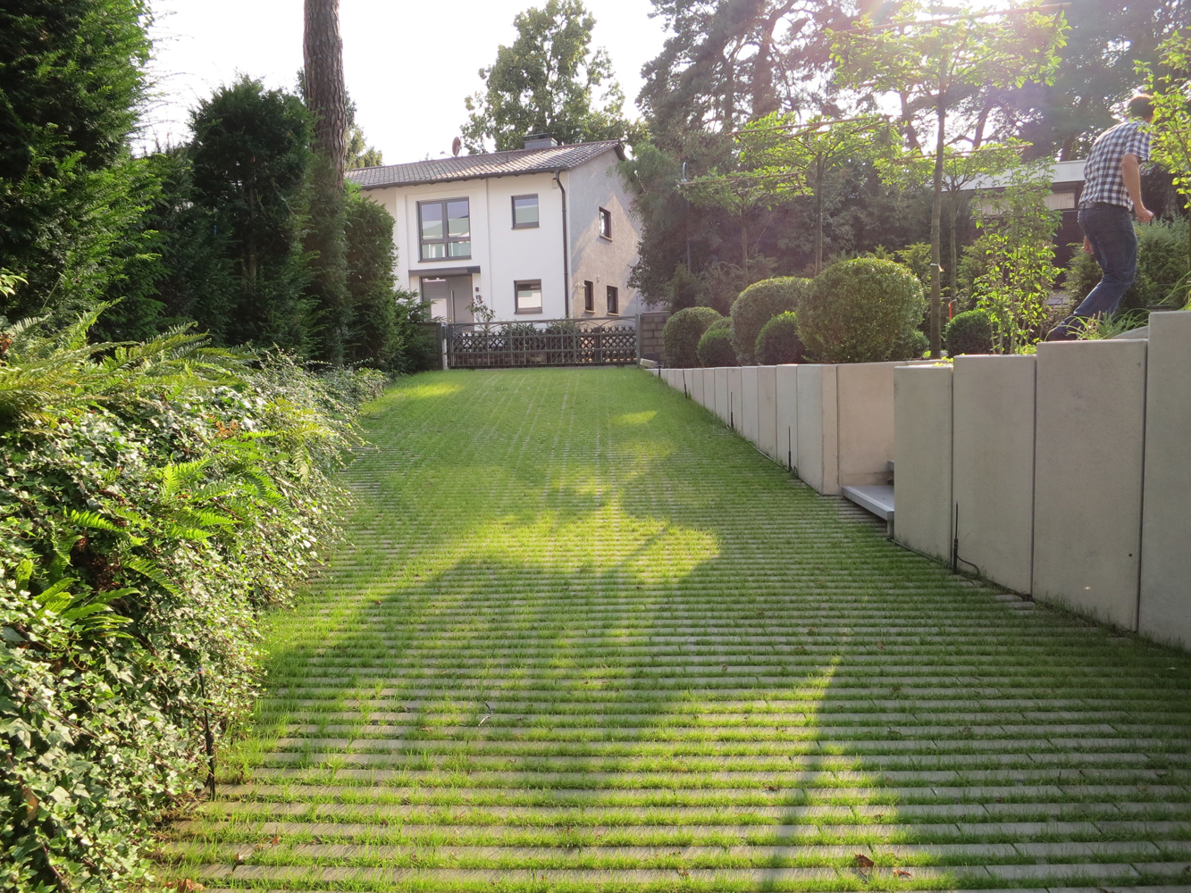 Die lineare Gliederung des Vorgartens ergibt sich aus der Architektur und der notwendigen Zugänge und Zufahrten. Über die jeweils auf der rechten und linken Seite des Grundstücks befindlichen Treppenanlagen erreicht man die Eingänge der zwei Wohnungen in den unteren Geschossen sowie den hinteren Garten. Eine durchgängige Holzstufe