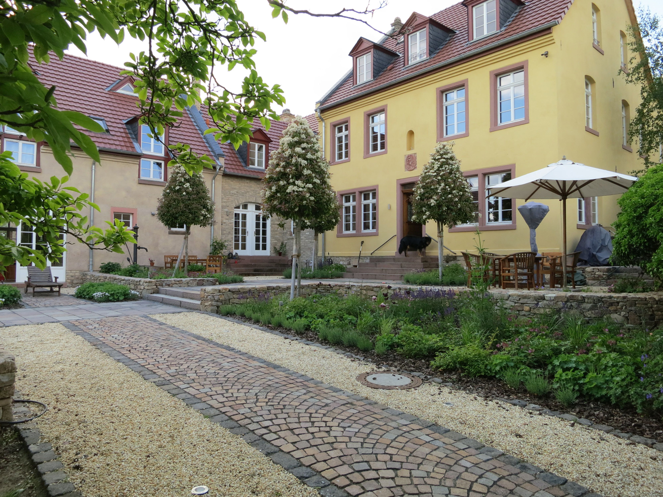 Sanierung der Gebäude und geben dem Außenraum einen unverwechelbaren Touch. Lavendelbeete und heller Schotter mit schönen Holzmöbeln unterstreichen den südländischen Charakter der Mühle und laden zum Entspannen ein. Inmitten der Weinberge liegt die Gottesthaler Mühle. Sie wurde liebvoll als Gästehaus ausgebaut. Der Garten und die Freiflächen der Mühle wurden der neuen Nutzung entsprechend umgestaltet. Eine harmonische Wechselwirkung entstand zwischen einer üppigen Pflanzenvielfalt im Garten zur Kulturlandschaft der Weinberge. Die immergrünen Bäume geben dem Garten eine ausgewogene Struktur. Natursteinmaterialien der Terrassen, Treppen und Mauern unterstreichen die aufwändige Die kleinen Terrassen der Gästezimmer liegen direkt vor Wiesen und Weinbergen und bieten zahlreiche reizvolle Ausblicke in die schöne Landschaft. Ein Löschteich wird demnächst als Schwimmbecken umgestaltet und wird mit Sicherheit das Highlight des Gartens werden.