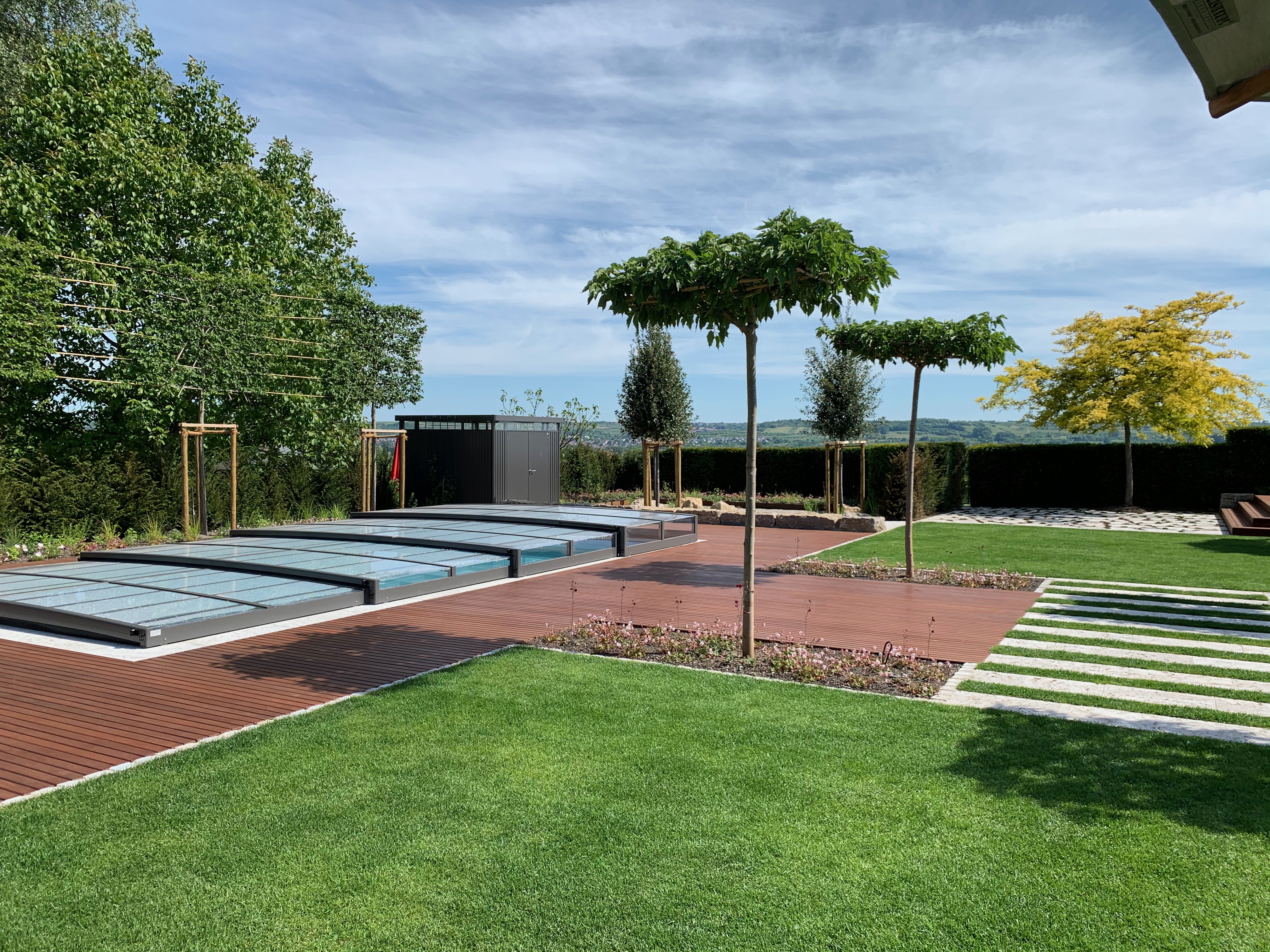 Im Frühjahr 2020 wurde mit der Anlage des Rasens der Garten fertiggestellt. Der Pool, die auffällige amerikanische Gold-Gleditschie und die Eibenhecken an der Süd- und Westseite sind als Elemente erhalten geblieben.