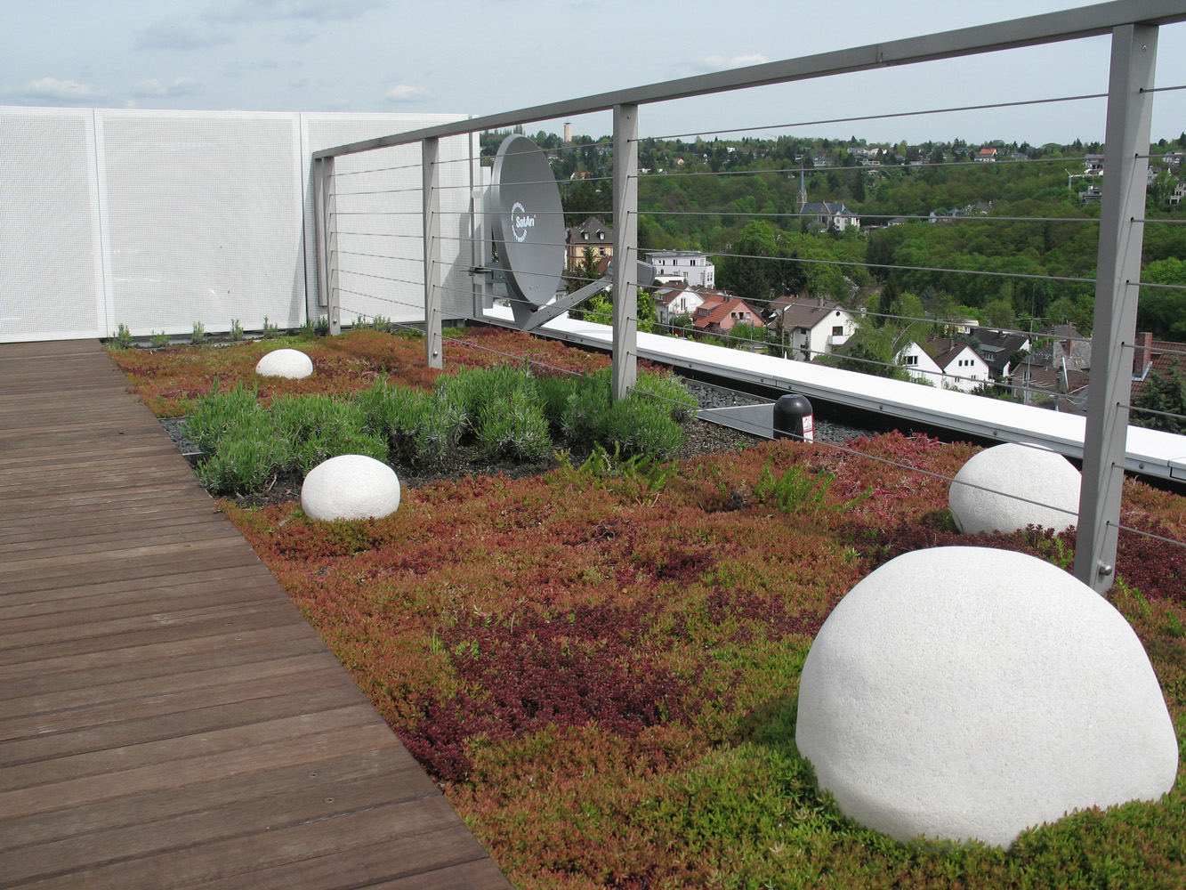 auf die Umgebung ist von allen Seiten möglich, da die extensive Bepflanzung bewusst niedrig gehalten wurde. Ein großes Holzdeck bietet Raum und Aufenthaltsqualität für alle Gelegenheiten. Die Leuchtsteine in unterschiedlichen Größen und Formen sind aus Glasfaserkunststoff und illuminieren die Dachterrasse in schönen Sommernächten.